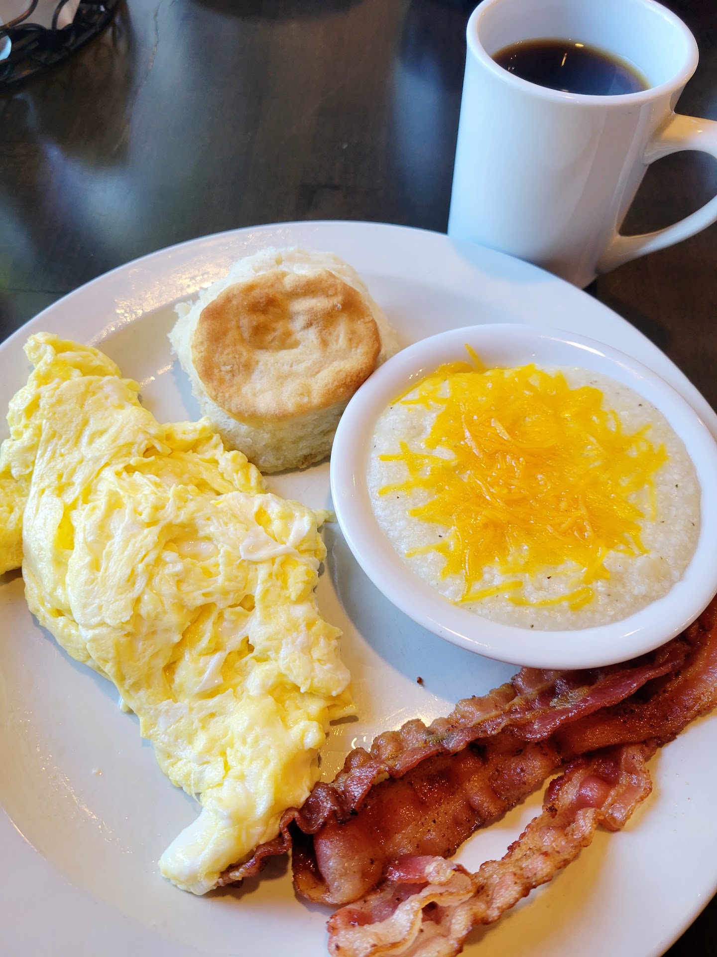 Read moreI'm surrounded by pancake houses so I decided to give this one a try this morning. It's a pretty solid breakfast place if you're looking for your traditional American breakfast. I was seated quickly And the server came over in a reasonable amount of time. I started off with coffee and I appreciate places that leave the carafe at the table because I'm definitely gonna make a dent in it and don't have to worry about flagging down a server for a refill. I ordered the 2 eggs and bacon with with cheesy grits and a biscuit and wasn't disappointed. I actually appreciate a place that doesn't salt their grits so then I can season them to my taste. The scrambled eggs were perfect. I'm really picky about my eggs and I absolutely hate when they're overcooked or there's even a speck of brown on them. Place is a little outdated and some of the booths could use some love but none of that detracted from my food experience. I wouldn't say this would be a go to breakfast breakfast place but I would recommend to people that were staying...