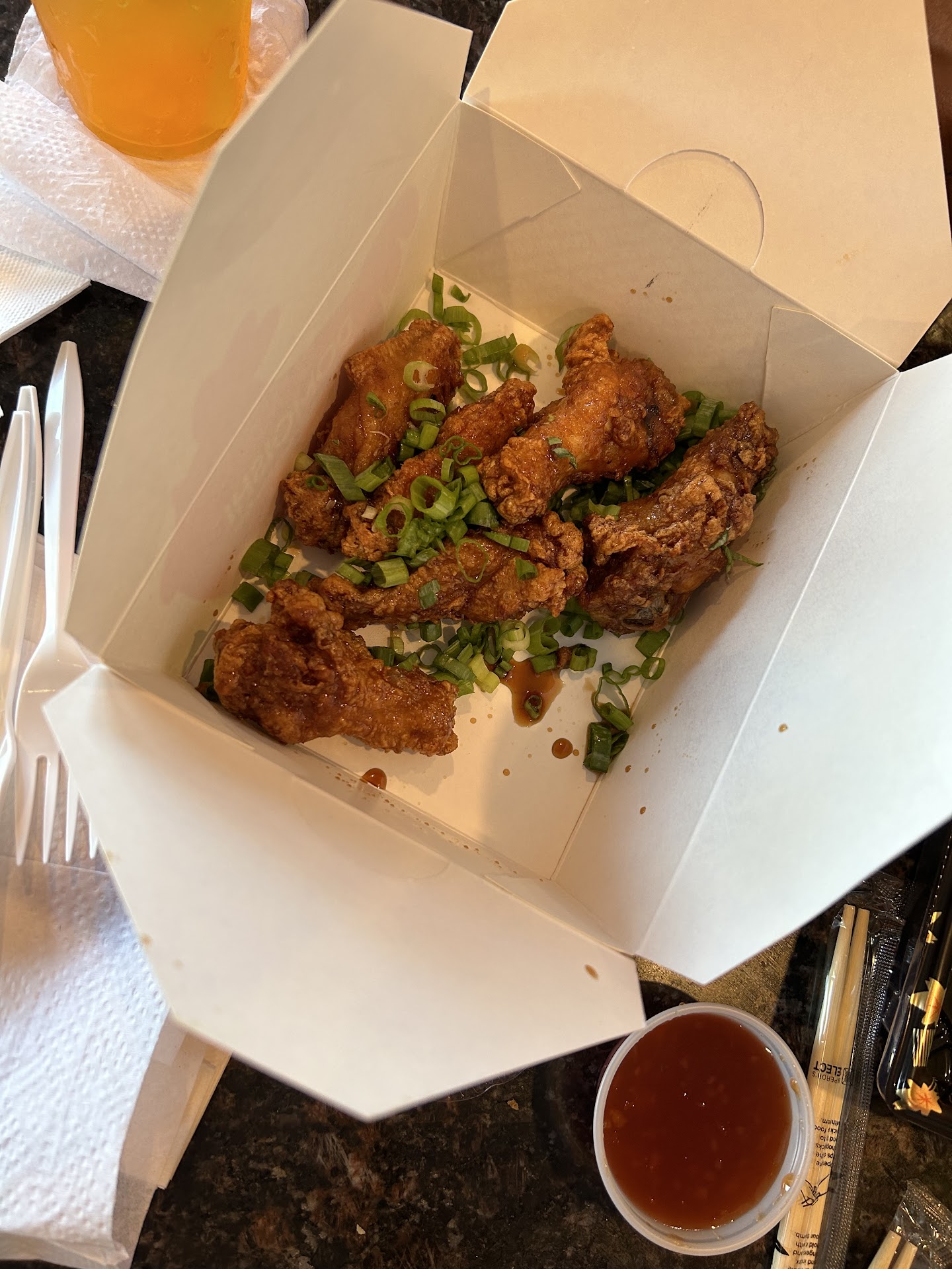 The ramen was good. The broth is a little salty so I didn't drink it down, but with the noodles it gives it a nice flavor. The wings were the best part, good size and crunchy. The lychee rose was by far my least favorite item. It felt like I was drinking perfume. I've had rose flavor before, but this was overpowering.