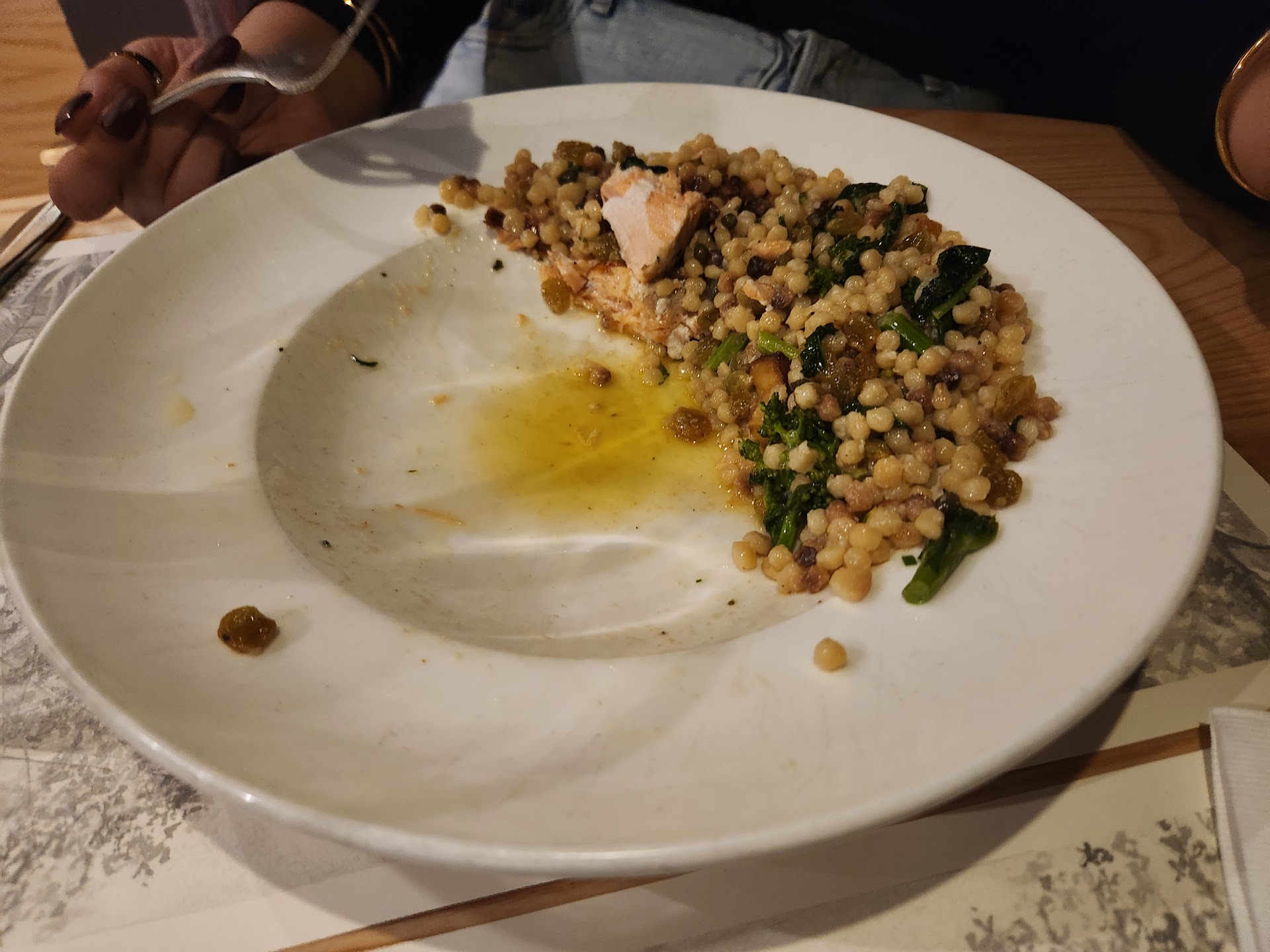 While the duck and salmon were both cooked beautifully, I found my duck lacking in flavor and the cherry demi glaze seemed more of a jus at the bottom of my plate under the Farro. My friends salmon sat upon Fregula pasta but there was a lot of oil at the bottom of the dish. It also seemed a strange mix with the golden raisins and capers as well. I asked for a recommendation of a wine pairing with the duck and was suggested the Cabernet Sauvignon Quilt. I'm not sure if something had adjusted my palate beforehand but it seemed quite acidic.
