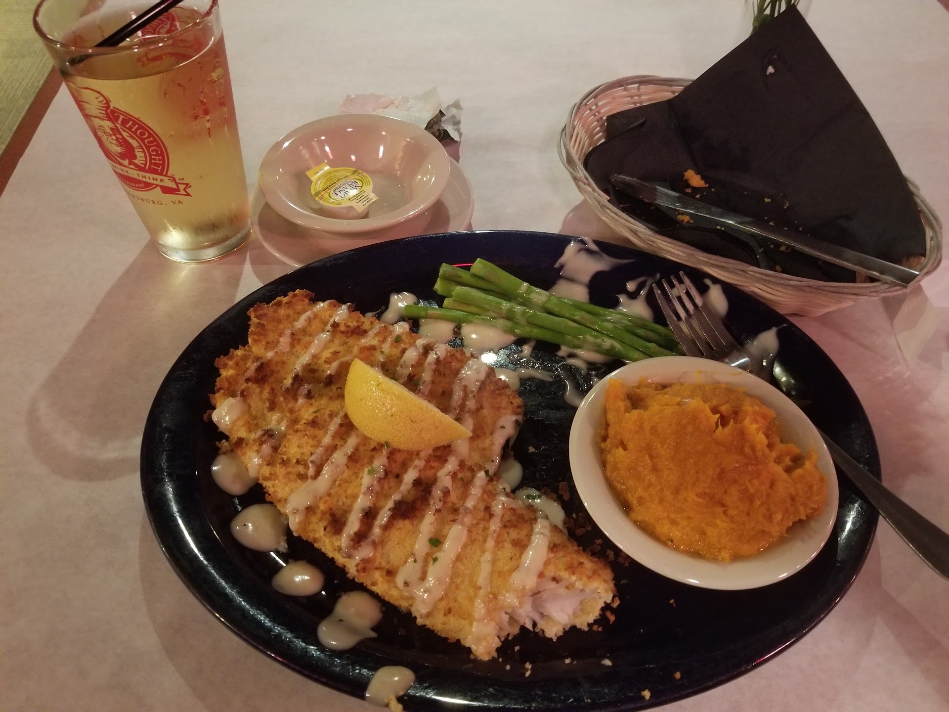 I ordered the Panko-encrusted Haddock with lemon cream sauce. It came with two sides: the asparagus with lemon butter (on special but could be ordered with the meal at apparently no addition cost) and the mashed sweet potato. The meal arrived quite quickly, half way through the cornbread. The fish portion was large, and done to perfection at the thick end (as it cooled, it was a bit crunchy at the thin end--eat from the thin end! ), overall, quite decent compared to to how baked fish often is in restaurants. There were about 6 asparagus spears, and they looked a little skimpy on the plate. There was no presentation for the mashed sweet potato, just a scoop in a small dish. The fish and asparagus were lightly swished with sauce in a zig zag pattern. I'm not sure this was a great choice as the sauce seeped into the panko, making the panko, which should be very crisp, kind of soggy. Still, that's sort of nitpicky, both sauces were delicious and well made, the consistency was perfect, the taste a light and pleasant note. All in all, it was quite enjoyable for a midrange restaurant.