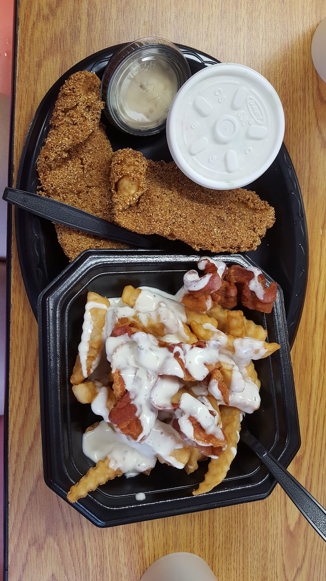My bacon ranch fries were slightly soggy, and the bacon was whole pieces just dropped on top, not crumbled up as it should have been. My husband's chili cheese fries were also soggy, and barely lukewarm. The cheese on them never melted.