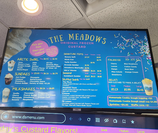 Ā Ā Ā Read moreI was really looking forward this place opening and I have not been disappointed! Iāve been three times so far and used the drive thru all 3 times. Ordering is easy and the menu has always been up to date since they have new custard flavors everyday. Service at the window is fast and friendly. Iām not new to frozen custard which is like a richer version of soft serve ice cream (not a mousse) and Iād say Meadows is definitely some of the best Iāve had. I also love that they rotate flavors which will keep me coming back. š I also tried the frozen yogurt (raspberry) on one visit and found it to be flavorful and delicious. Just a tip: It is a lighter treat so might seem thin compared to custard or soft serve. And the best part of all is that their employees are super friendly and I donāt feel judged for my multiple visits in a somewhat small timeframe (lol)! They even gave my pups a free sundae the first time I came in exchange for a quick photo! And let me get a free cone on my birthday when I misunderstood a Facebook post. Seriously made my day. Super sweet & awesome...