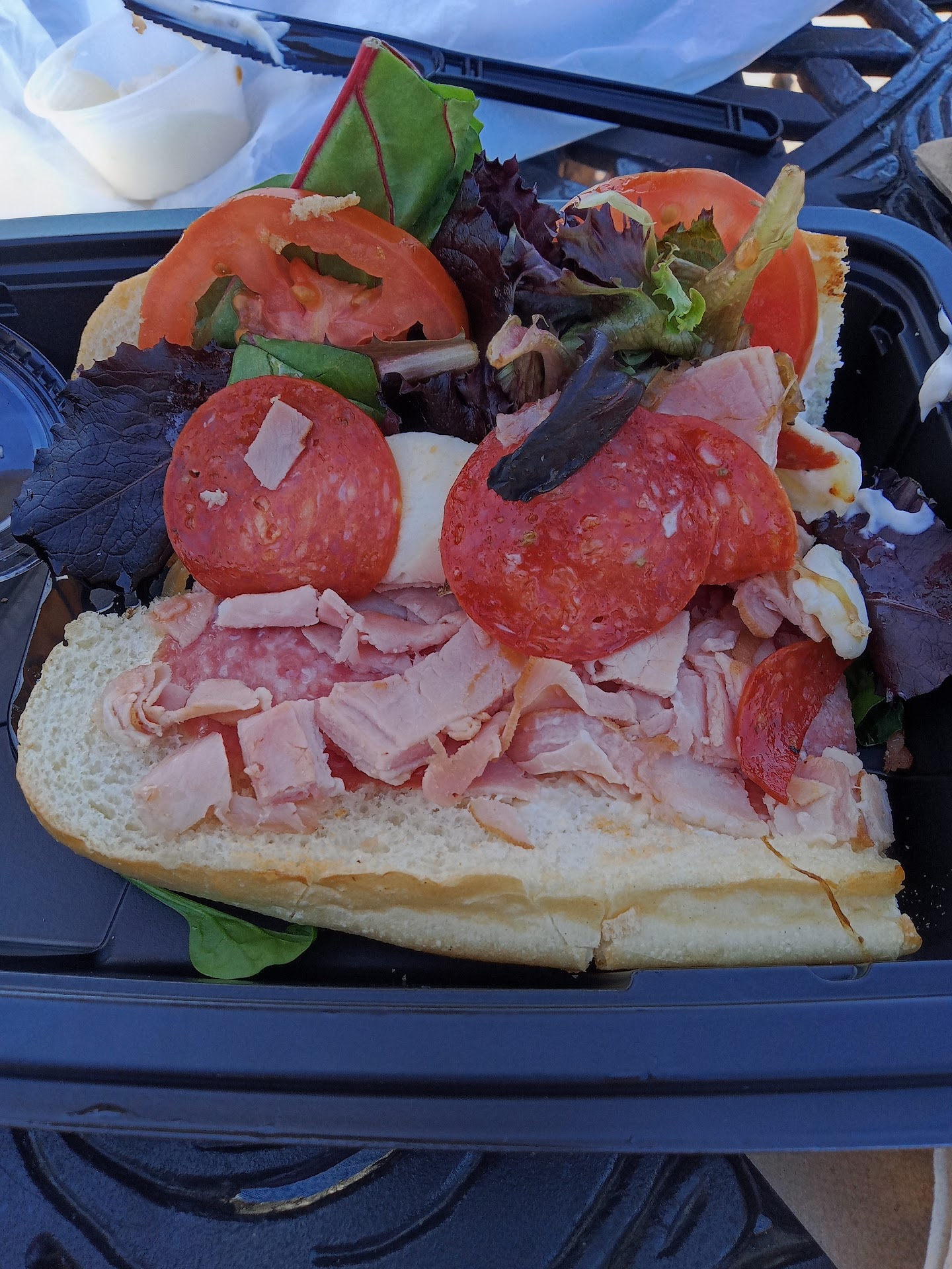 Read moreSaturday 3/24/25, around 12:00 noon. Very disappointed. I was in Merchants Square and stopped in Mellow Mushroom for a "to go" sandwich. It was a nice day and I wanted to eat outside. When I found a spot to eat, I opened the sandwich to put mayo on (I ordered it with mayo and they provided it in a cup on the side, go figure) and the picture shows my disappointment. Very, very little turkey, three slices of pepperoni and two miniscule slices of salami. This is your half Italian sub? Ten plus bucks? Seriously? It was half alright, half heartedly made. I mean, I get it. You're in it to make money but by cutting so far back on ingredients? Come-on people. I would be very surprised to hear that you're proud of such a skimpy sandwich. Would you serve this sandwich to your friends and family? If you would, I wouldn't be surprised if they stopped by a fast food place on the way home from your house.