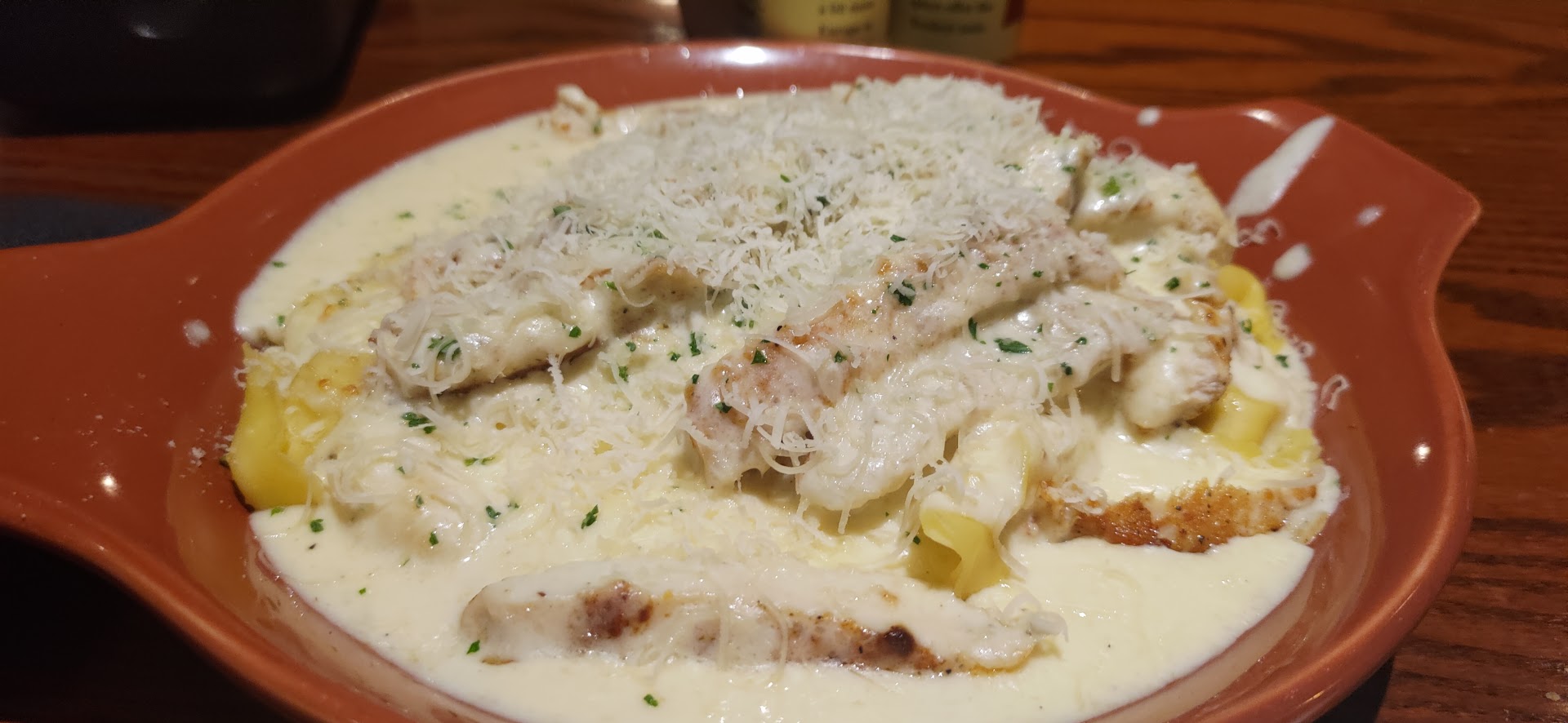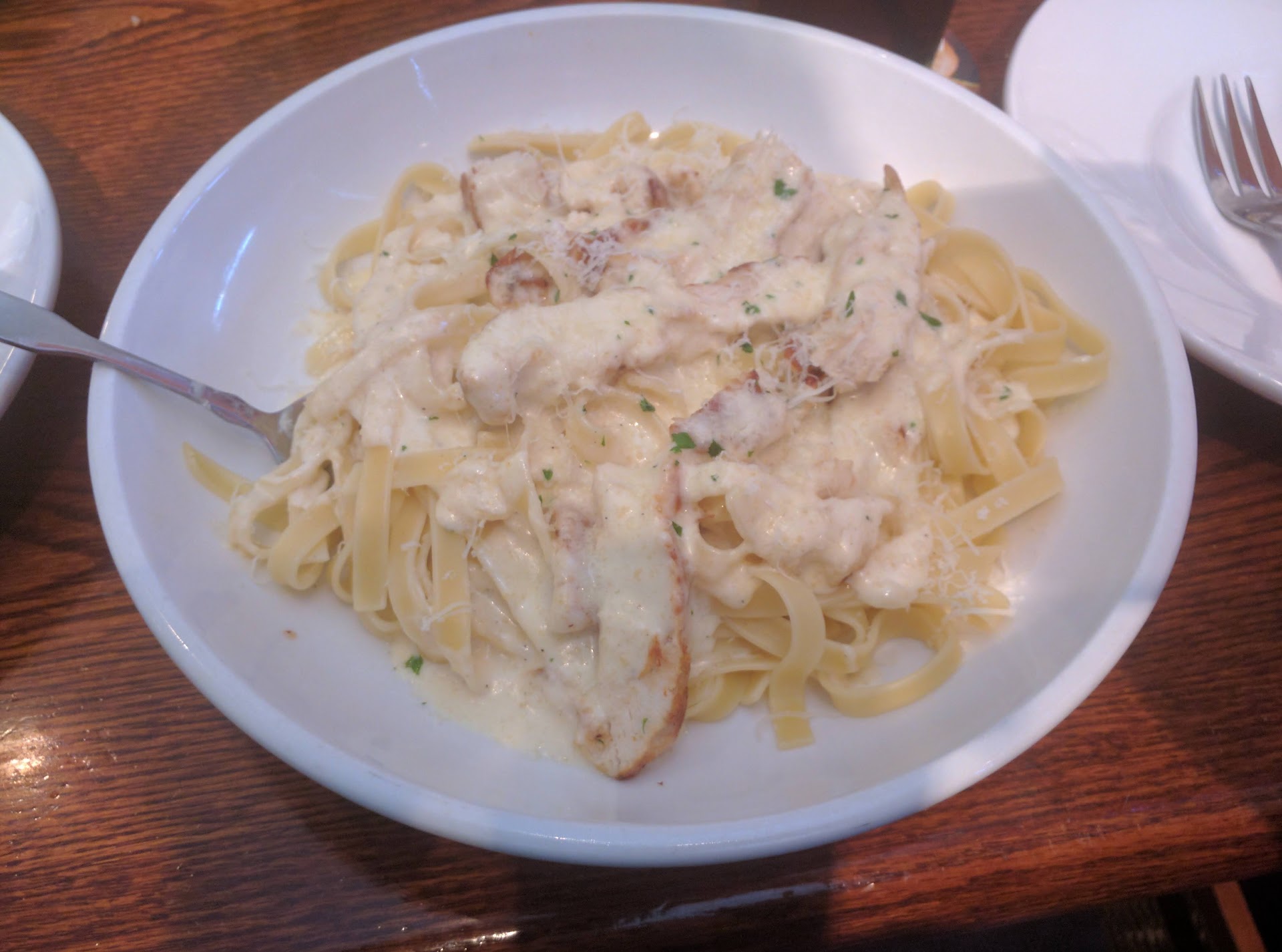 It was a sweltering afternoon in July when I first came to Olive Garden, and I was wishing I’d visited several months earlier. Chicken and pasta are the restaurant’s specialty, and while summers in the east coast are not kind to anybody, they are especially harsh if you happen to love chicken OR pasta. When the city seethes under temperatures in the 90s, thinking about a scalding plate of pasta sets off an internal battle of anticipation and fear that can make you feel like Alex in “A Clockwork Orange” after his reconditioning.