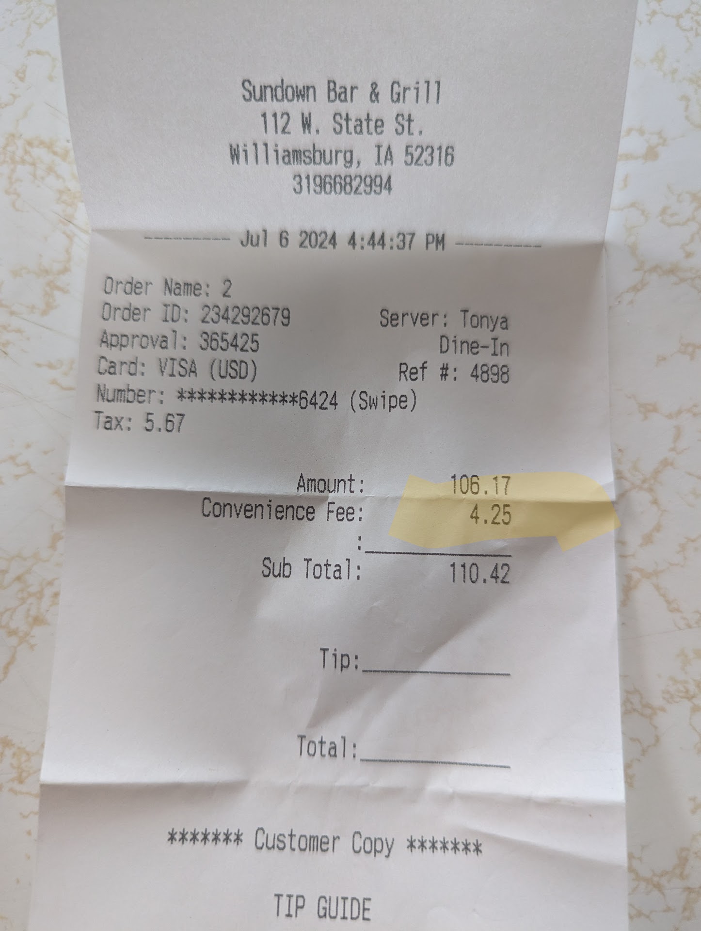 Read moreFood was decent, not amazing. The pizza would have probably been better if they had their stone hearth going. Service was slow. But overall, better than my dinner out last night. Until I got the bill. Not the total mind you. That was six people. But the fee for using my card. If I'd paid cash, then that fee wouldn't be there. But if I'd used their ATM, I would have probably gotten a different fee. That kind of stuff needs to be posted in bold letters on the door. You don't charge me for eating at your establishment. The customers are doing you a favor coming to eat/drink there. Needless to say, if this becomes common around restaurants, I will not eat out any more. I definitely won't be visiting this or any other place in Williamsburg. As the server said all of the places in town do it. Or, unfortunately, it will come out of the...