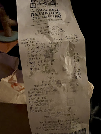 Christina was the Drive-thru employee that took my order, and she was very friendly (and actually made eye contact with me while taking payment and giving me my food/drinks). I ordered a crunch wrap supreme with no tomato, a bean and cheese burrito with sour cream and no onion, and two spicy potato soft tacos.