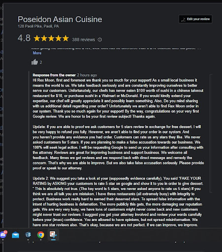 *Good luck finding lawyers to see a case here. When you do, I will show them the proof. of course I have been in your restaurant and ate your food. Otherwise, I won’t randomly spent time giving you review, threatening to me with legal action for giving you bad review and the truth for other customers is not going to help your...