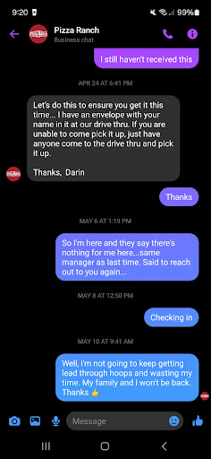 Ā Ā Ā Read moreI realize that when we went that it was a slower part of the day, and I understand what it is like to run short staffed. However while we were the not one person stopped by our table to clear plates, to ask about our experience, or touch base in any form. My mom had to ask 4 times for things to be restocked on the buffet and the reply she got was the person in charge of that was on break, like there was no one else that could do it. After some time we did get to speak to the manager and all she had was excuses about the slow time and being short staffed and some half hearted understanding that what we were asking to be restocked was easy to make. The pizza we ordered was missing toppings and the food on the buffet was either old and crusty or out. She offered zero accommodations for our experience and didn't even seem sorry that we were displeased. The only pleasant part of the whole thing was the young man at the register. They should thank him because he is the only reason they got a second star from me. I will not be returning to this location as it was the worst experience I have ever had at a...