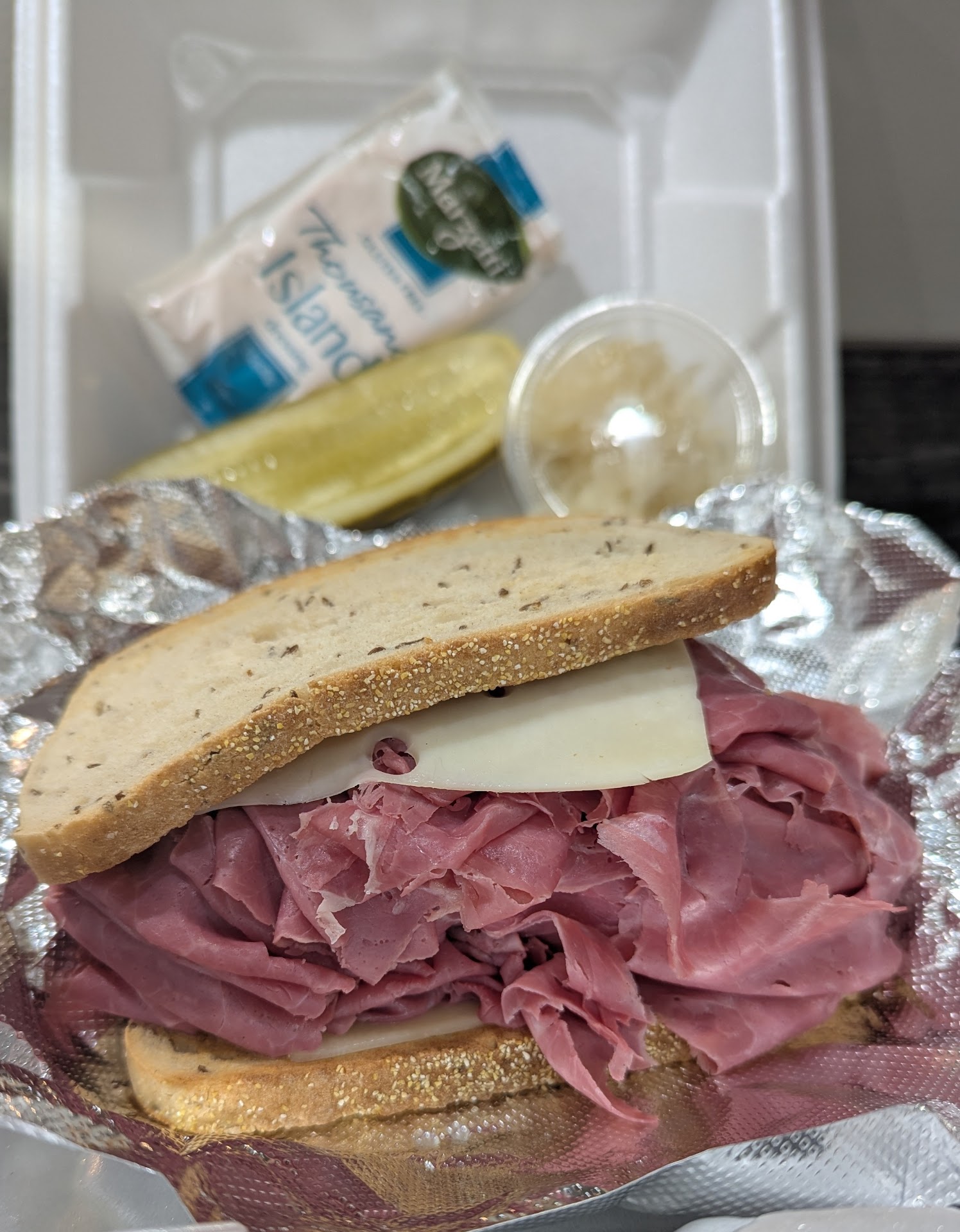 Service was good food is horrible I only left one star cuz I felt like they should've told me it was cornered beef lunch meat not the real corned beef that the store people cook the good type of corned beef that falls apart when you eat it well this isn't it this is lunch meat from the deli I will never eat corned beef from here ever again its horrible they should tell people its lunch meat not the real corned beef sandwiches it was so mushy in my opinion i was reading these reviews seen the pics thought it would be great never again it's warmed up corned beef lunch meat the texture is mushy its gross it was mushy in my mouth i couldn't eat it I didn't even swallow it I never ate a corned beef like this before and spent $11 on this thank god I got the fries on the side cuz i wouldnt have anything to eat on my lunch and I'm at work for 9 hours I'm not eating this sandwich definitely a waste Of my...