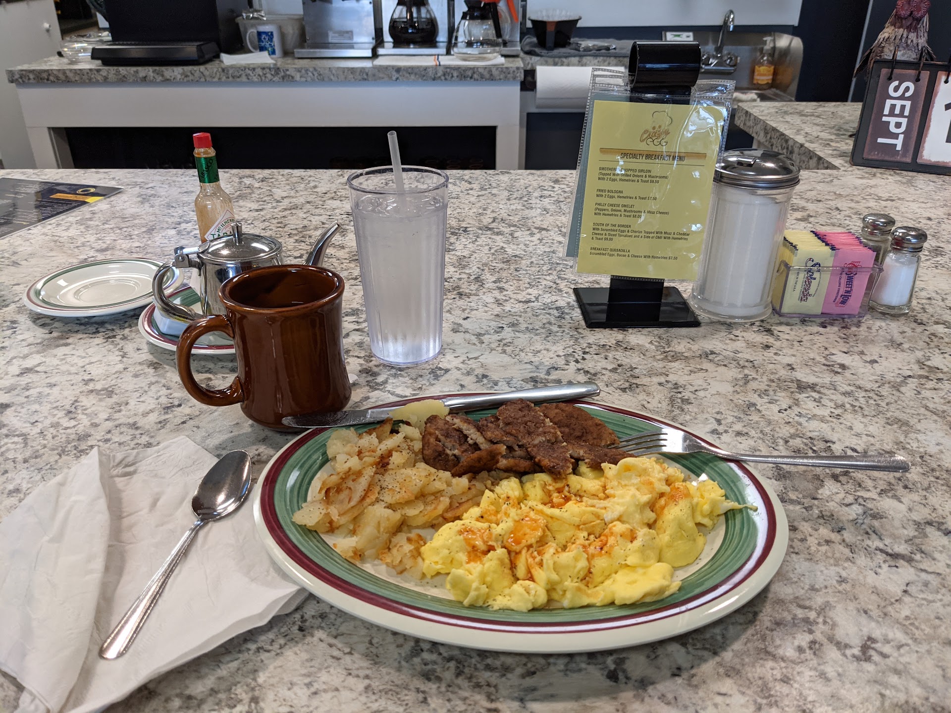 Read moreNice small little space. Good service. Our waitress was polite and timely. Nice and quiet at the time. Got two eggs, three fat sausage links home fries and toast for $8.50 so can’t beat it! Thank you much. I think our server was named Sarah. She was sweet. I came because of the cross on the wall. Needed to see that today. Cash only. lol they have signs and it written on...