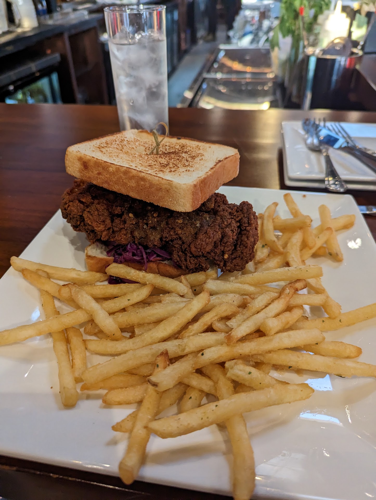 I was probably more looking forward to going here than was warranted, but it still was a terrible disappointment. We ate in, 2 adults. Very crowded and poorly set up front of house. Just very badly laid out. We ordered the raved about chicken, and fried green tomatoes. Ice tea, and a soft drink. The first red flag was the tea. Hard to believe you can screw up iced tea, but it was nothing more than weakly colored water. The glasses used are the old school very narrow bar glasses— sooooo when filled with ice, and they were totally brimming with ice, you end up with the absolute least amount of liquid for drinkage, neat trick but c’mon it’s not 1976 folks? And the waitresses are either too busy or still learning so nobody asks if you need a refill. The chicken came out very dark- close to maybe a little too dark, but oh that wasn’t the best of it, the chicken was VERY PINK, juices too ran pink inside of each piece! I thought at first it was maybe a lighting thing, but nope, it sure wasn’t! When poured onto the white napkin - pink as raw meat usually shows itself to be. I will say when asked about the various sauce options, our waitress wasn't kidding when she said the coffee BBQ really “has no flavor, not hot, not sweet, just no flavor.” Ooops and true? It might have been funny if it hadn’t taken 40 minutes to be seated, and the food was even fair. The fried green tomatoes were far from homemade good, but they were ok. Not anything to crave, or drive for, but eh. I just won’t go out of my way again to go. Not a destination place to enjoy good food, or even a great vibe. Kinda really bummed about that hyped chicken being so off the mark. You can only play cute country gals and dudes in your cowboy boots for so long if the food is as...