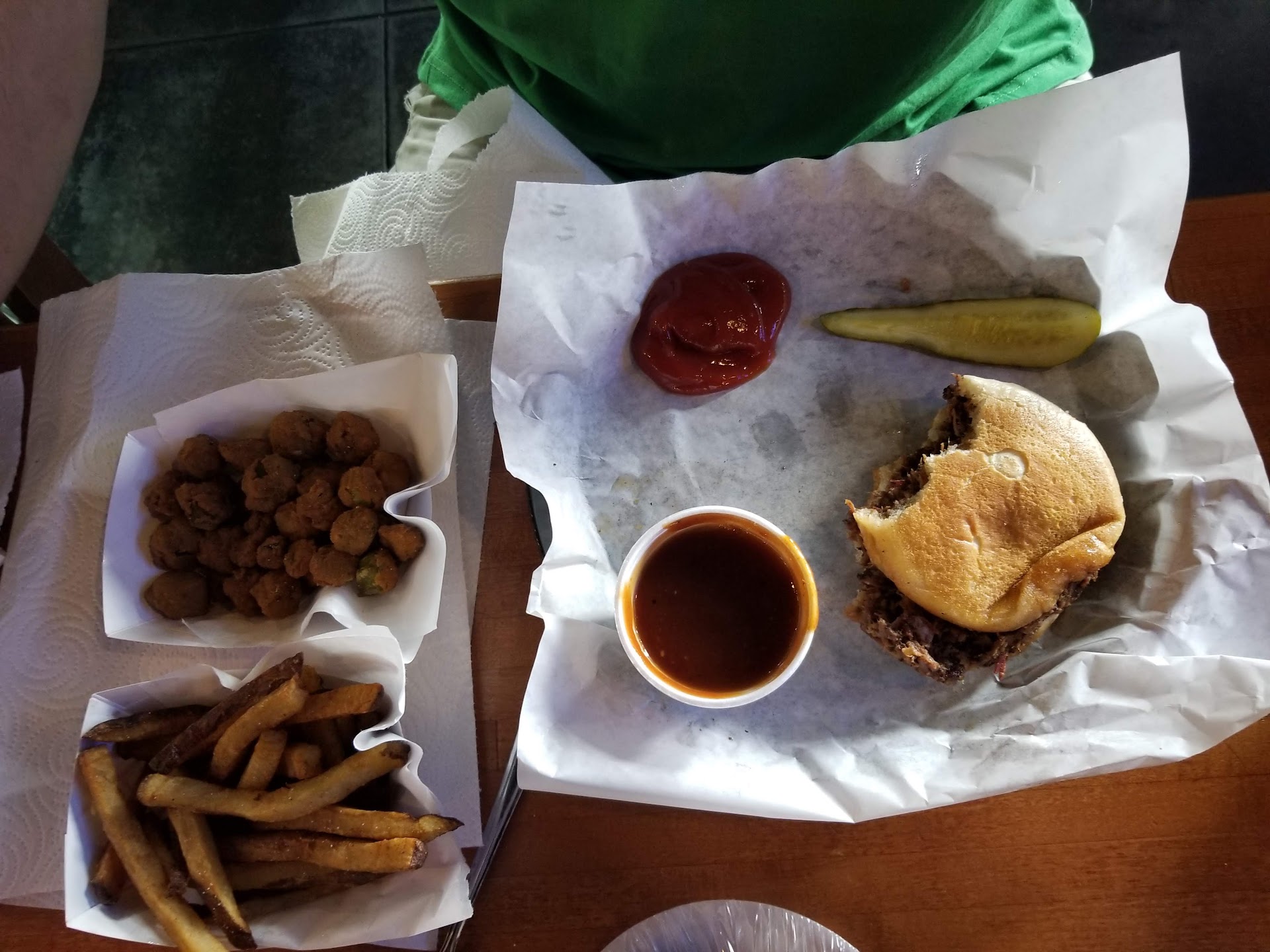 So this rating should be like 3.5 but that is not an option. This place has potential, could be one of the best, but falls short in the effort department. First, the food... The chopped beef sandwich meat was seasoned to perfection and did not even need sauce. But the bun was soggy. The barbecue sauce is watery. They make fresh chopped fries, the good kind, but they had no seasoning on them. The hamburger was good, but nothing special, and I do not prefer the ciabatta bun they put it on. Second, the service...this is where the place falls really short. So when you first walk in, it looks like you are supposed to go through the line to order. Well you can actually go sit at a table, and a waitress will come serve you if you are staying to eat. They have a sign, but we missed it. The people that were taking orders from those in line were packing boxes up for big orders, and would not even acknowledge us in line until they got good and ready. When I went to sit at a table there were like 4 waitresses standing around doing nothing for 10 minutes. They could have been helping the two that were taking orders from those in line. Then there was the runner boy who was running the food from the kitchen to the tables...He was so rude! My husband stopped to grab me a lid for my cup, and the runner boy nearly climbed over him to get by. He did not say excuse me or anything. A couple minutes later he came back through, and nearly run him over again. My husband is tall and burly. I recommend that boy slow down and get some manners. Third, the atmosphere...it is a really nice place with a fantastic patio, but hard to enjoy it with the staff's frowning faces and flies swarming us. The best thing about the place was the chocolate cake! It was outstandingly delicious! I would go back just to get another piece. My husband and I thought maybe they were just having a bad day. Then he talked to several guys at work...they all felt the same way about it. The place needs heart, someone to instill love and care back into it. It's worth trying, but don't let your expectations...