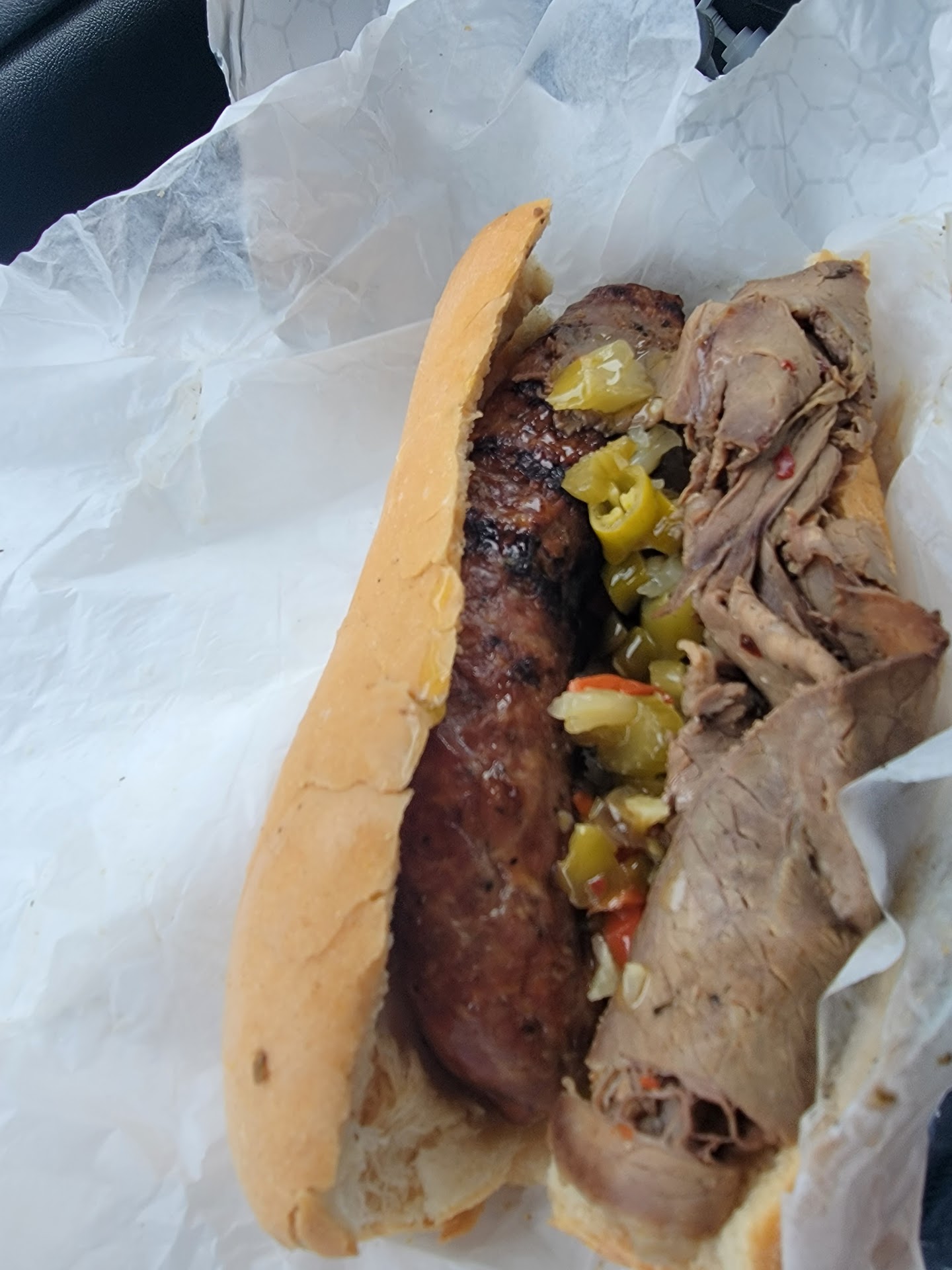 The best part was when they wait on you and ask it you’d like your beef, or in my case an Italian beef and sausage combo dry, wet or have the it dipped. I chose dipped because I like the au jus and the spices soaking the french bread.