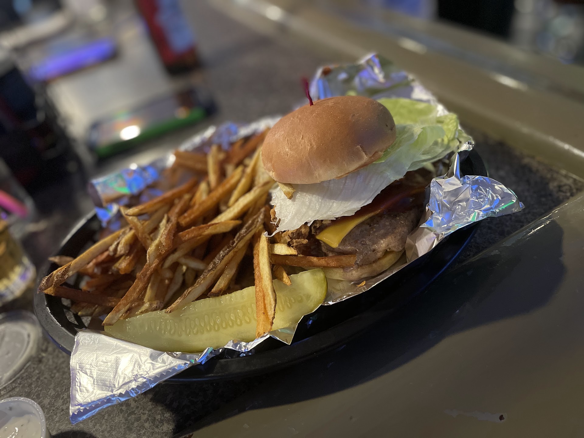 I recently have been coming here and every time I enter this establishment I am welcomed which is pretty awesome because it has home vibes meaning as the regulars rule this bar. The menu is pretty decent and the prices are awesome! I tried their food recently for once and I had the western burger with no bacon and it was prepared beautifully! The next time I came I had their loaded fries, chicken, and onion strings. They have a good signature sauce, I wasn’t a big fan of the loaded fries (fry lover, so i judge a little hard when it comes to fries) but everything else was delicious. The atmosphere is wonderful, everyone that is in there is chill and trying to have a good night. I recommend this place if you’re looking for great food and...