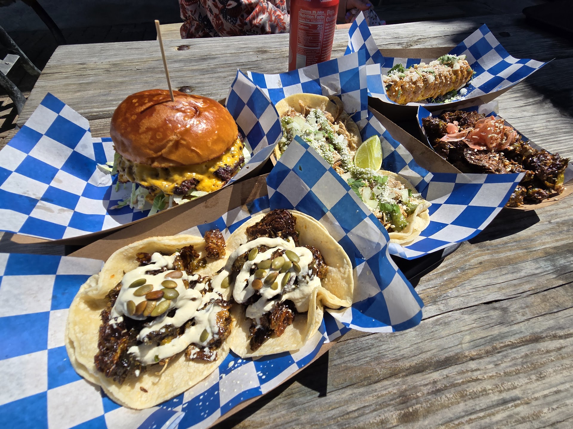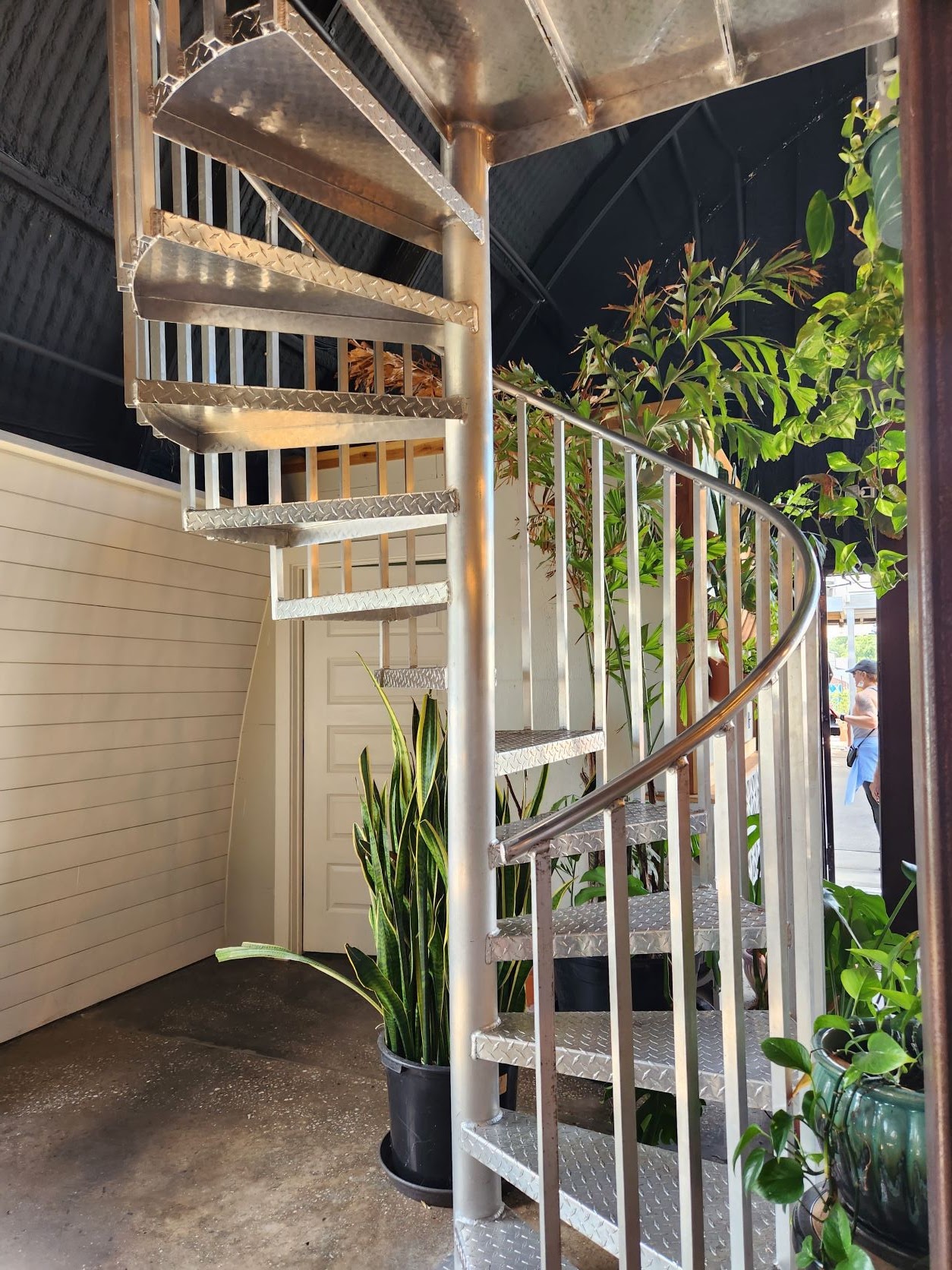 The beer garden is large with inside and outside tables/chairs. There's even seating upstairs that looks into the beer garden. There are planters on one wall and a cool spiral stair case.