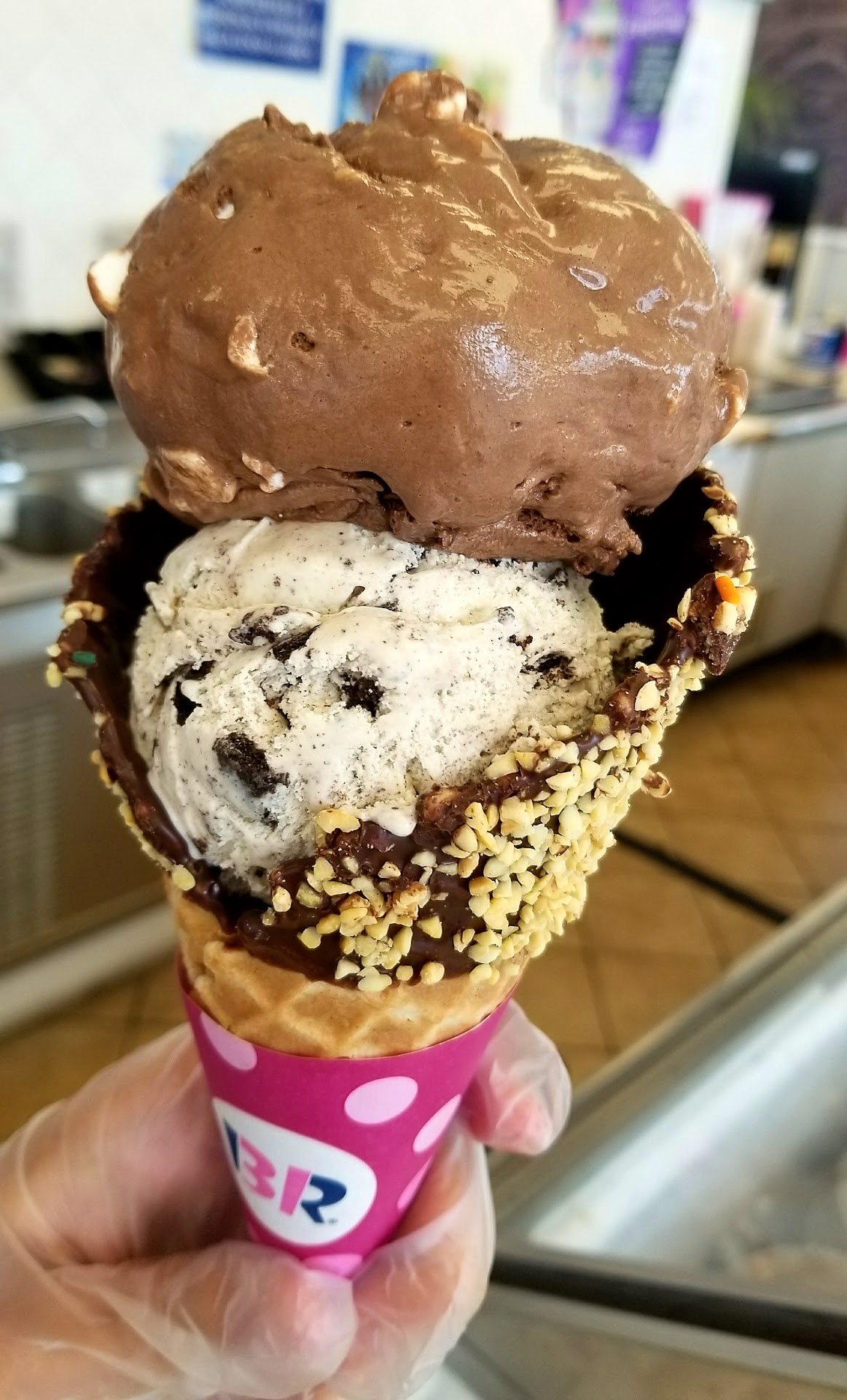 Read moreFor National Ice Cream Day, I went a different route with so many accolades already pouring in for my local favorite in Wilmington. I chose to enjoy a childhood past time favorite of mine...Baskin-Robbins 31 Flavors! This location is owned by a delightful franchisee & I knew I could still support a nostalgic, local business. They spared no expense with the generous scoops of Rocky Road & Cookies & Cream piled into a chocolate-dipped waffle cone, rimmed with pulverized peanuts. Mrs. enjoyed a cake cone with scoops of Very Berry Strawberry & Chocolate. Although we had to eat these as fast as Joey Chestnut in Nathan's Hot Dog Eating Contest due to the sweltering heat, I felt like a 6 year-old kid again for a few minutes! Thank you again for great ice cream & friendly service...even though the 2 young gentlemen working today, had no clue it was National Ice Cream Day. Lol. UPDATED...