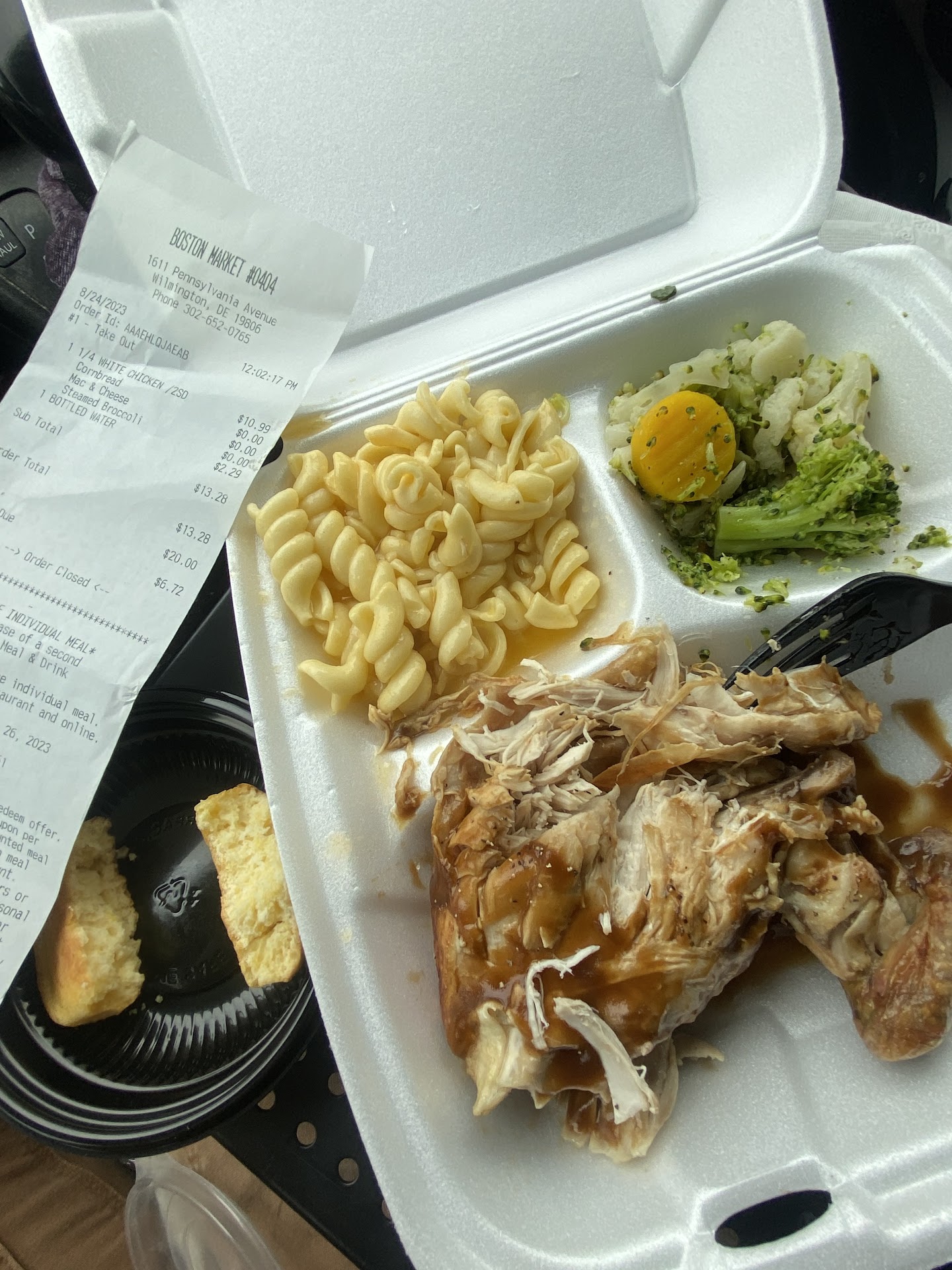 Read moreMy heartbreaks to have to say any of this about a place I used to enjoy very much, however it needs to b said so here goes..... Lovie and I went tonight for after work dinner and was very please with the young lady (Manager) Serving the food she was very pleasant, friendly and most of all apologetic for EVERYTHING that they DID NOT have such as eat in Plates, sandwich bread, soda in the machines and the numerous amount of sides they were out of...... Its hard being in management and having to constantly tell hardworking hungry customers that you DON'T have this and or that..... And let's be honest it's not just this location that's out of food its ALL of them in Wilmington ie: 202,and claymont as well..... It seems as though Boston Market may b disappearing soon 😳🤫🤔 Please improve soon we...