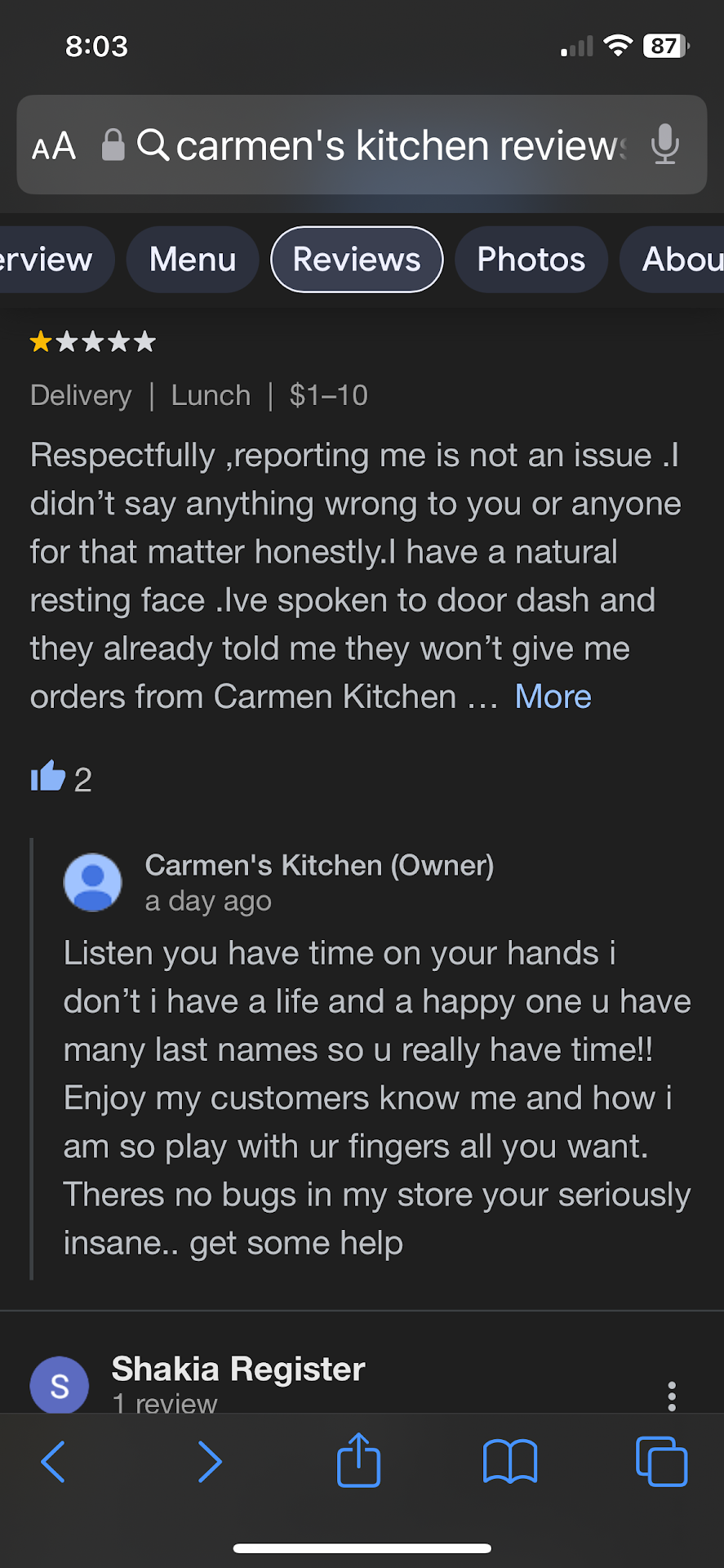 The only reason I’m writing another review is because my other review was deleted. I am a door dasher and I have been doing this for years .Im a 4.9 rated dasher with a 98-99% completion rate . I am a college student(of 2 degrees),a mother and wife . In other words I have a life.I am very fortunate to live a comfortable life daily .I thank Allah every day for this. I don’t respect when business owners don’t operate appropriately and get mad at the customer for expressing the first amendment .I walked in Carmen kitchen bc I was given a 20 dollar order for 2 places . Which any dasher knows is good money . When going inside I immediately noticed it was no AC or fans operating . I’m happily pregnant which may not be the store issue but the heat is harsh and unsuitable conditions for customers and honestly even yourself and staff to work in .I’m an advocate so with that being said if I notice something that is not right I will speak on it not just for my self but for everyone .When I was at Cameron kitchen I was very unhappy and concerned because of the extreme heat and long waits for food .The owner called me miserable but it was the unwelcoming heat that made my experience terrible . The only reason the lady has something rude to say to me is because I wrote a negative review . If you look up other reviews anyone that has given her a lower review she gets smart with them and belittles them .She told me I don’t have no life because I made 2 reviews but I just really believe that she doesn’t make enough money and her company is struggling because it seem the only one who doesn't have a life is the women who can’t afford to have a running AC or Fan in her place of business.Serving her customers with her door open giving flies and other flying insects the opportunity to invade the business.Also having her customers that she so call enjoy being hot and gasping for cooling air .I seen flies coming in and out the building .But since I have no life according to you I will be making a report to OSHA and report the hazardous conditions you are placing your customers and fellow workers in .I will also inform them on everything including the flies from what I noticed . I will even call the Better Business Bureau and write a letter to the attorney general in Delaware detailing what is going on . I already know when you see my review you are going to say the upmost rudest things in the book to me but just remember this all started because I respectfully stated an opinion and you are upset you don’t like it .You will no longer be disrespecting me or other people for not giving your restaurant the review you want it all ends Tuesday when I make the report . Now have a great day baby you will no longer be disrespecting me .If you remove this review I promise you I will take screenshots to show how much you want to hide from your customers and continue to make sure I post reviews . My next step is taking it to...