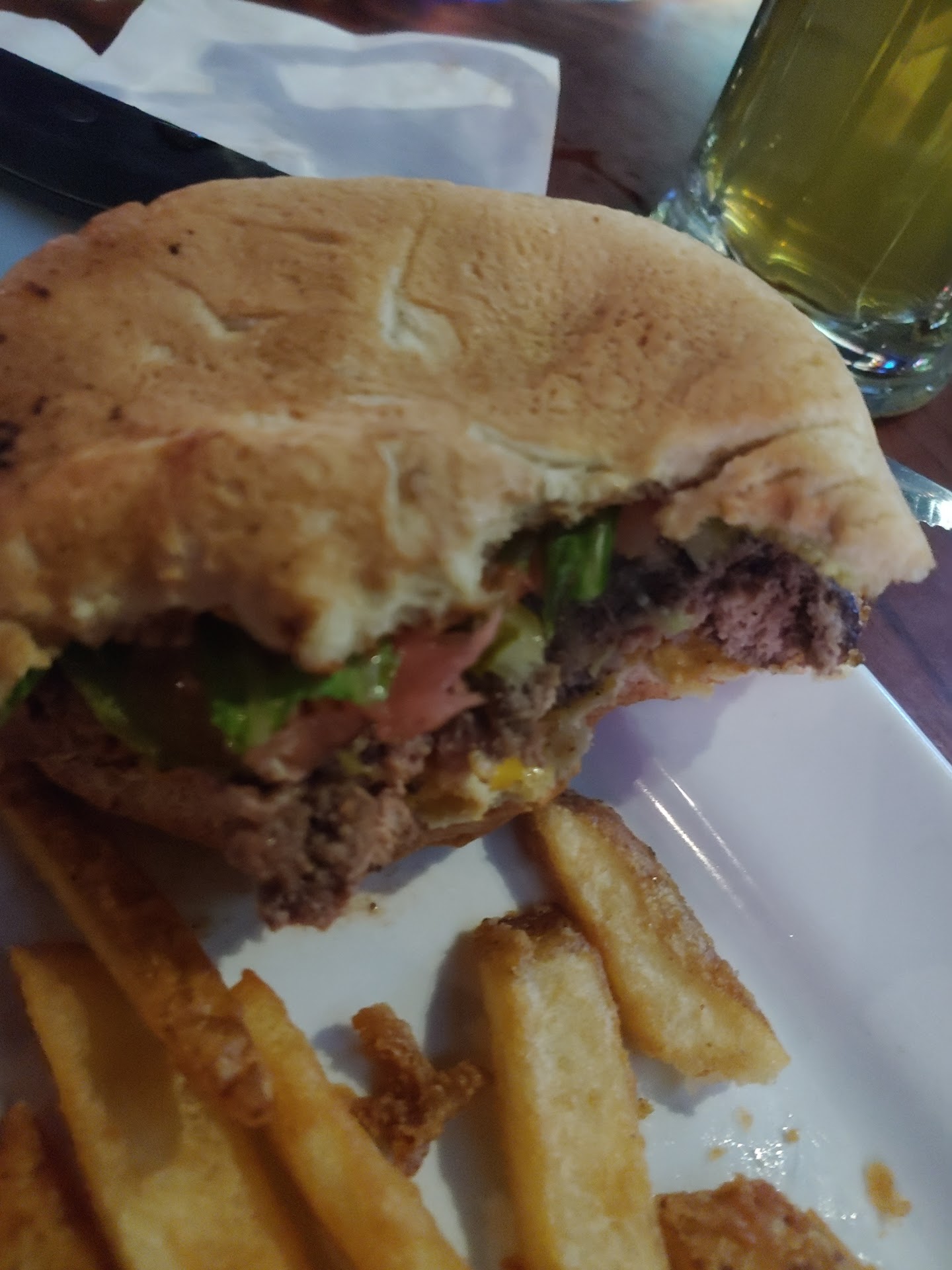 FOOD: The Steakhouse Burger (Chargrilled with signature steak seasoning, aged Swiss, grilled mushrooms, beer-battered onion rings, roasted garlic aioli on a toasted brioche bread, according to their current online menu). This burger confused me a little since it tasted so good, but was missing some ingredients and replaced by others?!? As you can see in my previous pics, there were no beer-battered onion rings nor grilled mushrooms on my burger. The roasted garlic aioli was a pleasing spread on the burger, as was the steak seasoning, as advertised, but my burger included house-made pickles, tomatoes and lettuce, which was not supposed to be on the burger. Toasted brioche bread? Check! It was just an odd FrankenBurger that was surprisingly good. Pros: sensational steak seasoning on the patty, garlic spread and cooked a perfect, medium-well...just as ordered!! Cons: Not sure what happened with the mixup of ingredients on my burger?? The other area of opportunity noticed: lettuce on the burger was soggy and limp. Regardless if the excuse of...the lettuce had been exposed to an abundance of moisture from the ingredients, coupled with the time it took to deliver, the lettuce, it was still a topping that should have never been. The patty was perfectly cooked and seasoned, the Aged Swiss cheese....oh my!! Those were the standouts of the burger for me and although I did not get what I ordered, it still came out tasting good. Just to ensure I did not mixup my burger with my wife's, I checked hers and confirmed it was just a patty and cheese, plain. The star of the meal were those fries!!! Dude...seriously I could eat a bucket of these. Wonderful flavor, cooked perfectly and the seasoning is extraordinary. LOVED the fries. Overall, it was very good food, just not what I ordered and paid for, scoring shy of 4 plus stars SCORE: 3.5 STARS!!