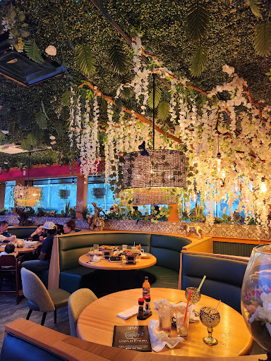 The jellyfish dancing across the giant television in the ceiling above the bar that was surrounded by more (artificial) flora and fairy lights throughout the restaurant truly painted a magical atmosphere.
