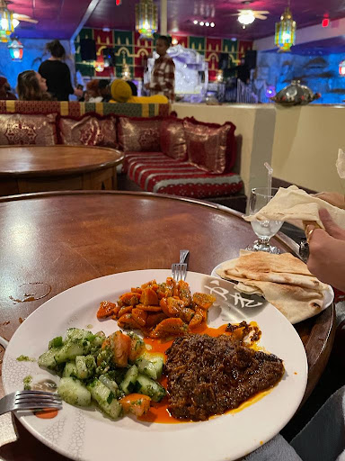 Read moreWe ordered the 7 course meal and were pleasantly surprised when the server draped towels on our laps and washed our hands with rose water. The first salad course was very tasty especially the eggplant. The b'stella was a little disappointing, after having it many times in Morocco we were expecting shredded chicken, but this was ground chicken mixed with a lot of egg. The spicy chicken was pretty spicy and tangy and we loved it. The lamb with almond and honey rice was oily and wet but still tasty. The fruit was impressive, we were amazed by the strawberries. The mint tea came sweetened which we didn't like, it was too sweet, so maybe ask for sugar on the side. The bathrooms were clean but basic The hookah was in a separate heated outdoor space, and required sharing of booths. We were not a fan as it took away privacy and made it awkward. They also had VERY loud music which we asked to have turned down, which they did. She used an electric starter for the hookah which we thought was cool and a good addition. The servers were all friendly, the male servers were very polite, and sweet. The female servers were shouting in front of us amongst themselves, and felt like they were ready to call it a day.