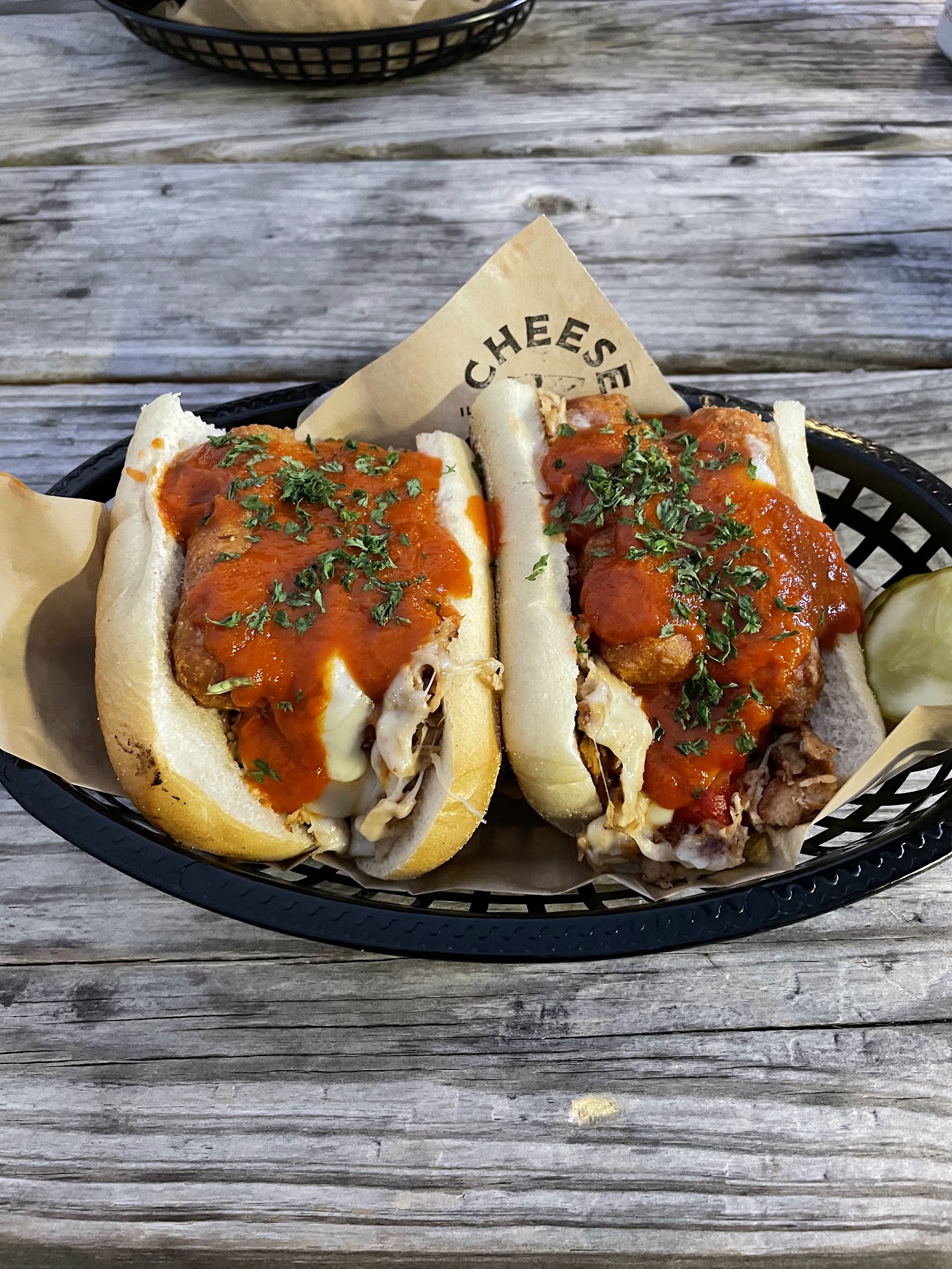 FOOD: The O.G. (Cheddar, American, House-made tomato jam) + Buffalo Baby (Havarti cheese, buffalo braised chicken breast, house made buttermilk ranch, quick pickled carrot & celery slaw) + 2 orders of Garlic Parmesan Fries. Let's start with the fries...golden brown, crispy, seasoned wonderfully and not greasy. My wife says they are the best fries she's ever had. I don't think I disagree. The O.G. and Buffalo Baby sandwiches were nothing short of culinary masterpieces. Each sandwich had fresh bread, buttered and grilled to perfection. Each bite delivered just the right amount of "crunch", followed up by smooth, creamy cheese blends inside. I tried both sandwiches to see which was my preferred choice, but I simply could not decide. The O.G. has this homemade tomato jam that is superb. It reminded me of a subtle apple butter that offered up sweet notes and is a perfect marriage with the cheeses. Buffalo Baby?? I can't find enough words to describe it. I'm not a fan of celery, but Cheesesmith strategically pickles this strong, pungent veggie along with carrots and the taste is sublime. The pickling of the added veggies transforms their natural flavors into a semi-sweet, edible garnish. The buffalo sauce has adequate kick and not too much heat. Everything was fresh, delicious and mind-blowing. I would have never guessed a "grilled cheese" sandwich could hold so much merit. 5 STARS!!