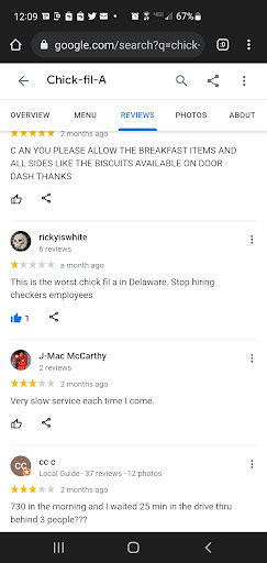 Their worst restaurant in the area, they've gotten our order wrong 3 times, we'll this last time I finally had enough and called their 800 # since you can't call the store and I don't live nearby, after being on hold forever finally was told someone from that location would contact me within 3 days, well fast forward 1 week and nothing, meanwhile they charged me $9.70 for a Cobb salad that they didn't include in my order. No biggie I figured I'd stop at the store the next time I was in the area, well I did that today with my receipt in hand, I spoke to a friendly cashier who said he'd get his manager (Darcy) well she came over while counting money and a fake smirk on her face and said almost immediately, uhh no we can't do anything about that 😂, I was in shock she literally was looking at me like I just wanted a free salad, I told her I called their customer service and haven't received a call back and she proceeded to tell me you just have to keep waiting 😂 😂 😂, never in a million years did i think out of all fast food places chic fil would be the ones to treat their customers like this. At this point I could care less about the money or stupid salad it's the principle. Word to the wise don't leave the lot without checking your order because they will not fix their mistake once you do, and chick fil a if you're reading this Darcy the manager on Duty was extremely belittling and condescending and refused to correct the mistake, she just restored to scolding me for coming back 4 days later instead of turning around from 12 miles away and going the same day to...