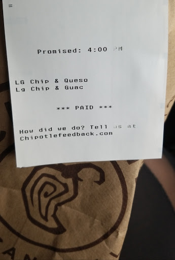 Read moreAs a former manager of Chipotle it hurt me to witness how throughput was handled. I came in about 2 weeks ago during the evening rush and I see there was one person on the entire line. The manager was helping everyone else and there was no crew that was willing to help the line person. The line was wrapped around the building and there was no sense of awareness of what was going on. There were other customers that were looking in disbelief because there was not one crew member that felt the need to hop on the line to assist the line worker to the point where I saw at least 5 customers left. I understand being short staffed but the arrangement of staff should have been assessed. There should have been no way during this time should takeout just stand in the corner and wait on orders as the main priority is to take customers that are in front of you. There should have been no way for the manager to fry chips when there was still a good amount stocked with both big and little bags. There should have been no way that the cashier is just waiting and watching the line worker suffer she should have washed her hands, and hopped on tortilla to get things moving and return to register once there were orders to cash out. I have never waited in a line where only 5 couples or families were in front of me and had to wait 50 minutes to even get my order started. I really challenge you all to find better use of your staff roles because the culture of what I know Chipotle to be was not present on my visit. In addition, please remind your staff that chewing gum is not okay on the line or anywhere where there is food around especially if they aren't...