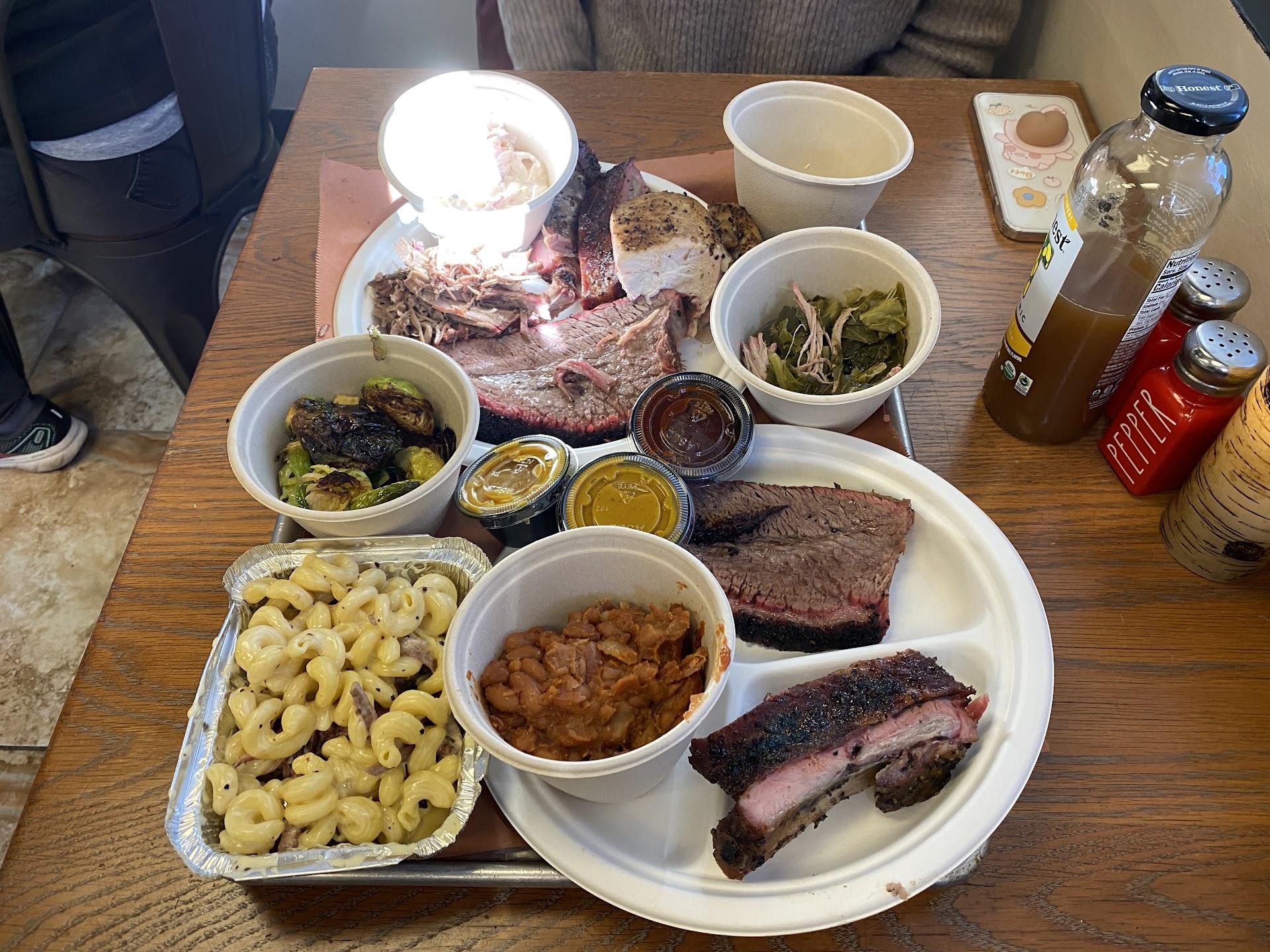 We ordered the Sampler Dinner (Brussels and Collard sides), a 2-meat combo dinner (Corn salad and Coleslaw side), PB and Mac attack 16oz, Baked Beans 8oz and a Pork Belly Sandwich. Overall with tax and tip about $125.