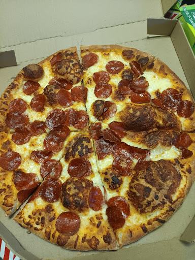 Read moreDomino's Pizza should start including a knife with all of their pizzas. Because of the weak-willed workers there are unable to use a pizza slicer to cut entirely through a pizza. They have a giant knife behind the counter that is apparently there for show and is no longer used to slice entirely through the pizza. I was able to personally observe the red-haired gentleman behind the counter attempt to cut through a pizza and it was not something for the week of heart to watch. The amount of force that he put behind it seemed gargantuan but when I got home it was all for naught. Maybe the knife is just dull at the moment and they need to send it to get sharpened. But I think that this gentleman behind the counter was just given too much milk as a child. I would recommend not slicing the pizzas on top of giant stacks of cardboard boxes. It's probably the reason the pizzas are not being sliced correctly and it is also likely a health code violation.