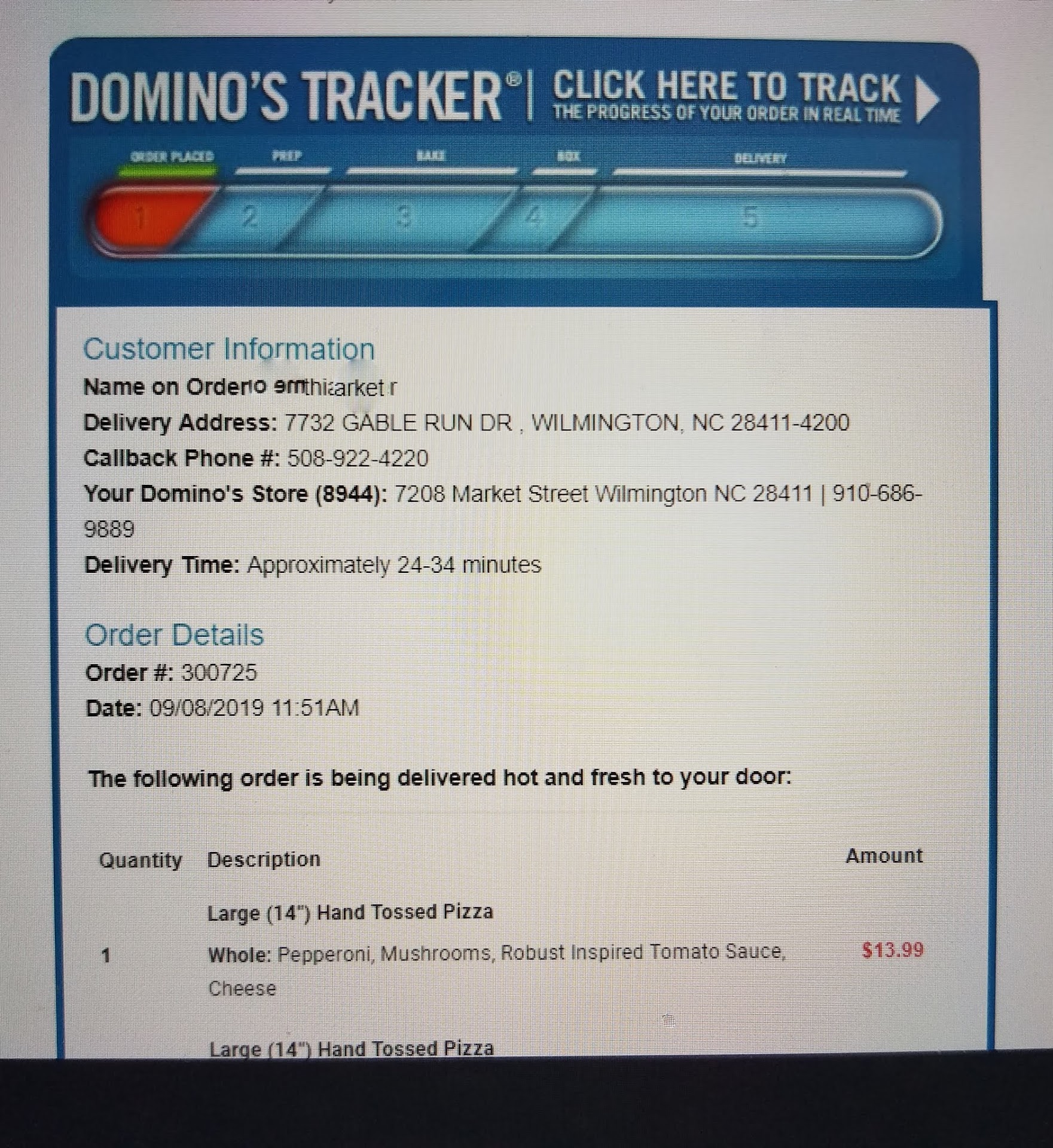 Read moreI ordered pizza about an hour ago (5pm EST), and just called the store to check up on the delivery status. When placing the order online, I was quoted a 39-49 minute wait time. After an hour hit an our Domino's Tracker still didn't even read "Baking" yet, I decided to call.