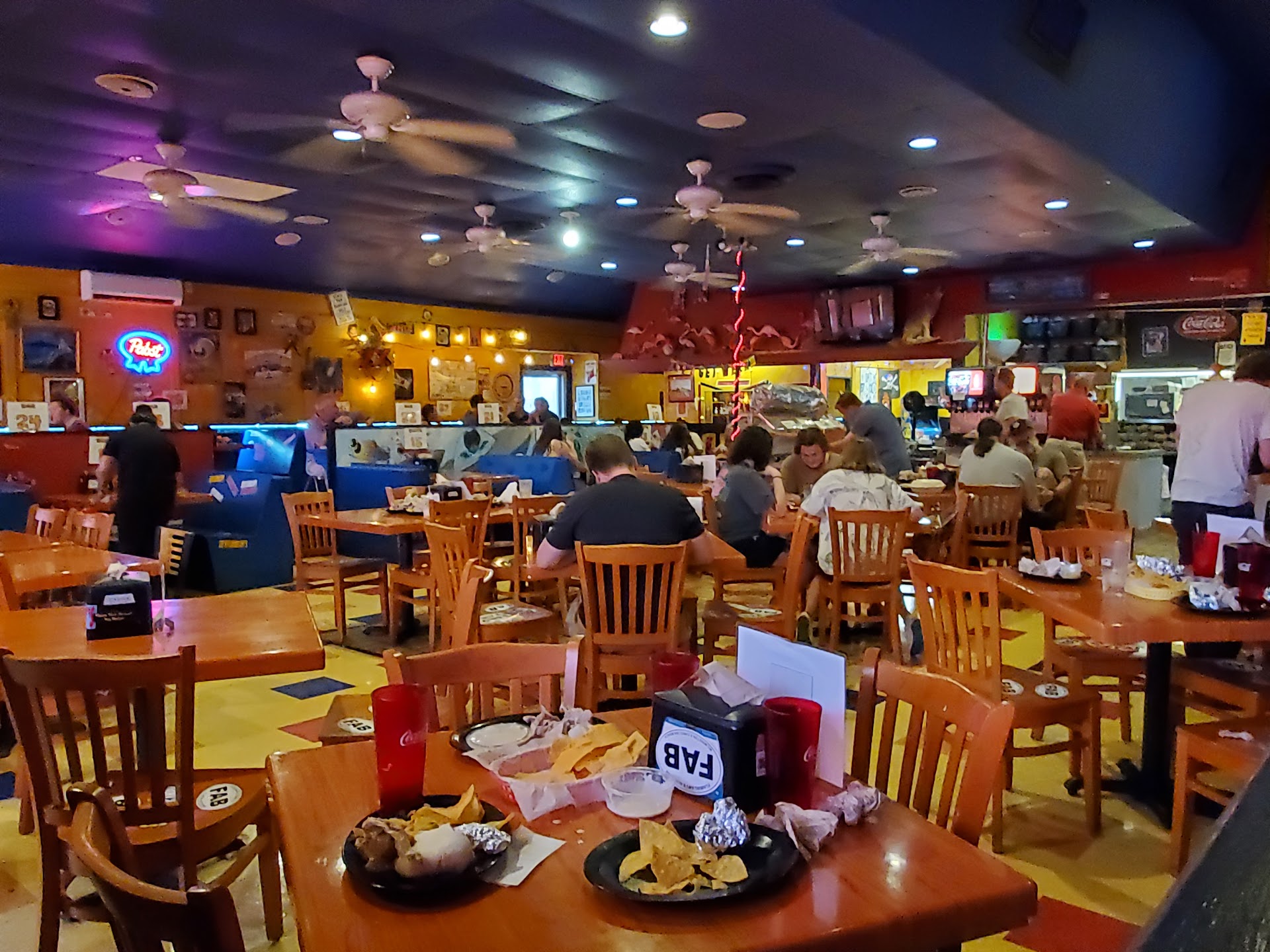 Read moreFood is meh (pretty bland) and the chips are stale, but perhaps I am being a bit biased because I was basically grossed out by the dirty atmosphere that I was scared to even guess what in the heck the kitchen looked like (cleanliness). The entire place is just nasty dirty....sticky disgusting tables, trash cans overfilled and spilling over with trash, bathroom is filthy and smells like straight up sewage, nobody making the food wore gloves (đ€ź), etc. I never once, in the 45 minutes or so we were there, saw one person ever wipe down or clean any tables or clean anything. The dust flying around in the air was like a dust snowstorm. And no, they weren't busy nor appeared to be short staffed. It's just overall a petri dish of God knows what...especially during the pandemic when many other places are still taking some type of precautions to ensure at least a somewhat more sanitary atmosphere. Like I initially said, food was alright (but Chipotle or Moe's are way better tasting and both are located nearby this particular Flaming Amy's), but the thought of how nasty the kitchen could be (if it matched the restaurants cleanliness) turned me off immediately. With every bite, I was expecting to experience a crunch...a crunch of cockroach, that is. Luckily, that didn't happen but it surely wasn't out of the realm of possibility after seeing this place. So, it's a NO for me, dawg. I don't recommend. Oh and yeah, the employees aren't friendly at all. Rude service, unless you enjoy someone rushing you when ordering and literally rolling their eyes if you have a question about the menu. Also, coming to our table and throwing our food down in front of us then walking away was uncool. This was my first, and surely the LAST TIME that I'll ever eat there. Never will I go back there again unless I develop dementia...
