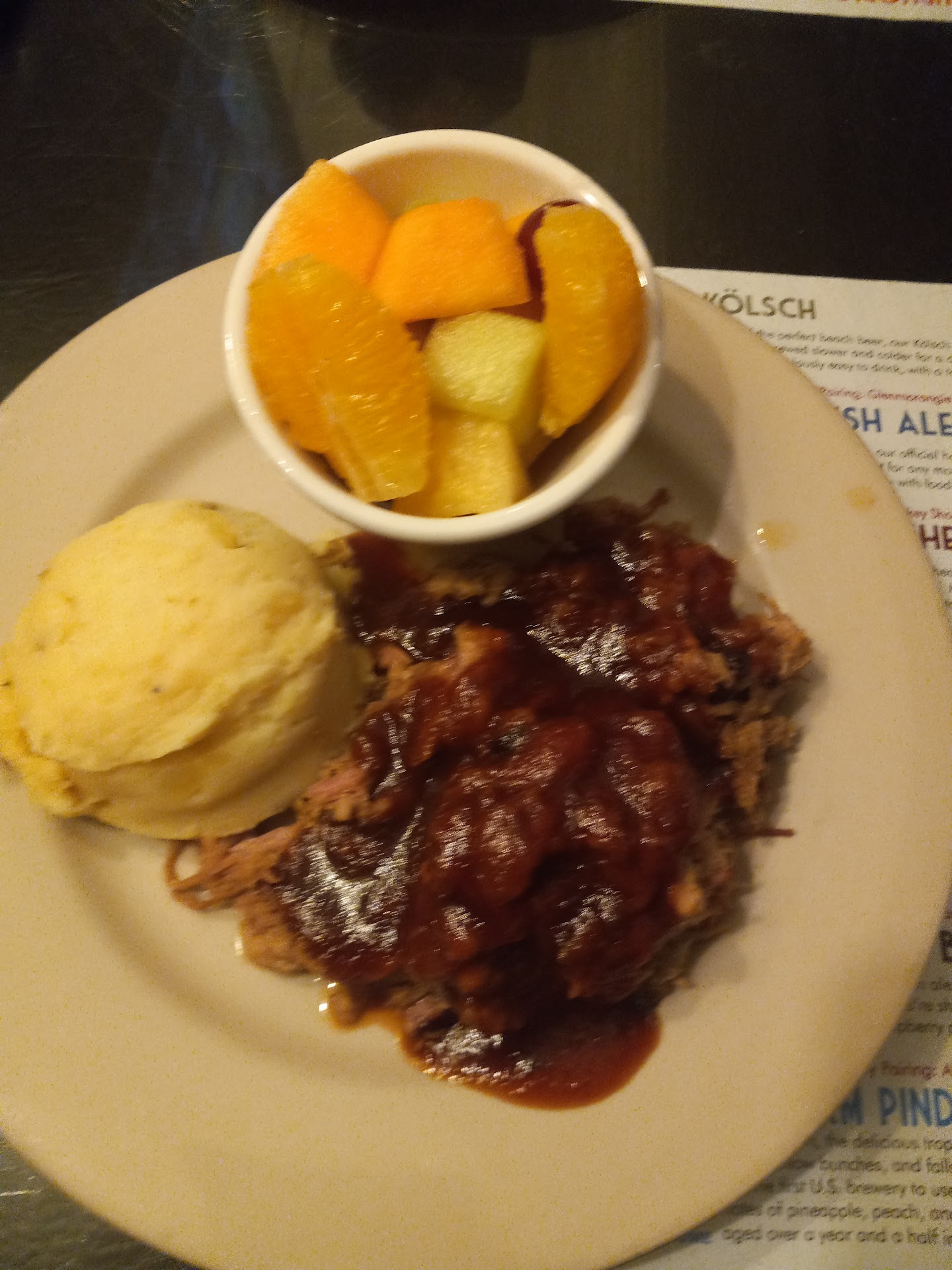 Lastly I will comment on my own entrée to which I ordered the double cheese burger. By the description and cost I expected an experience and received yet again disappointment. I asked for their signature scottish ale bbq sauce just in case I needed a rescue and subsequently in fact did need it. The patties on this burger were reminiscent of a fast food chain and I can assure you for this price point I was not loving it! Lacking in texture, char, depth of flavor but did excel in moisture. The cheese was a depressing sliver holding on to dear life as it melted into the grease of the patties. The what I presume are house made pickles were actually not bad but the only thing that saved this meal was the surprisingly good beer based bbq sauce which I did enjoy.