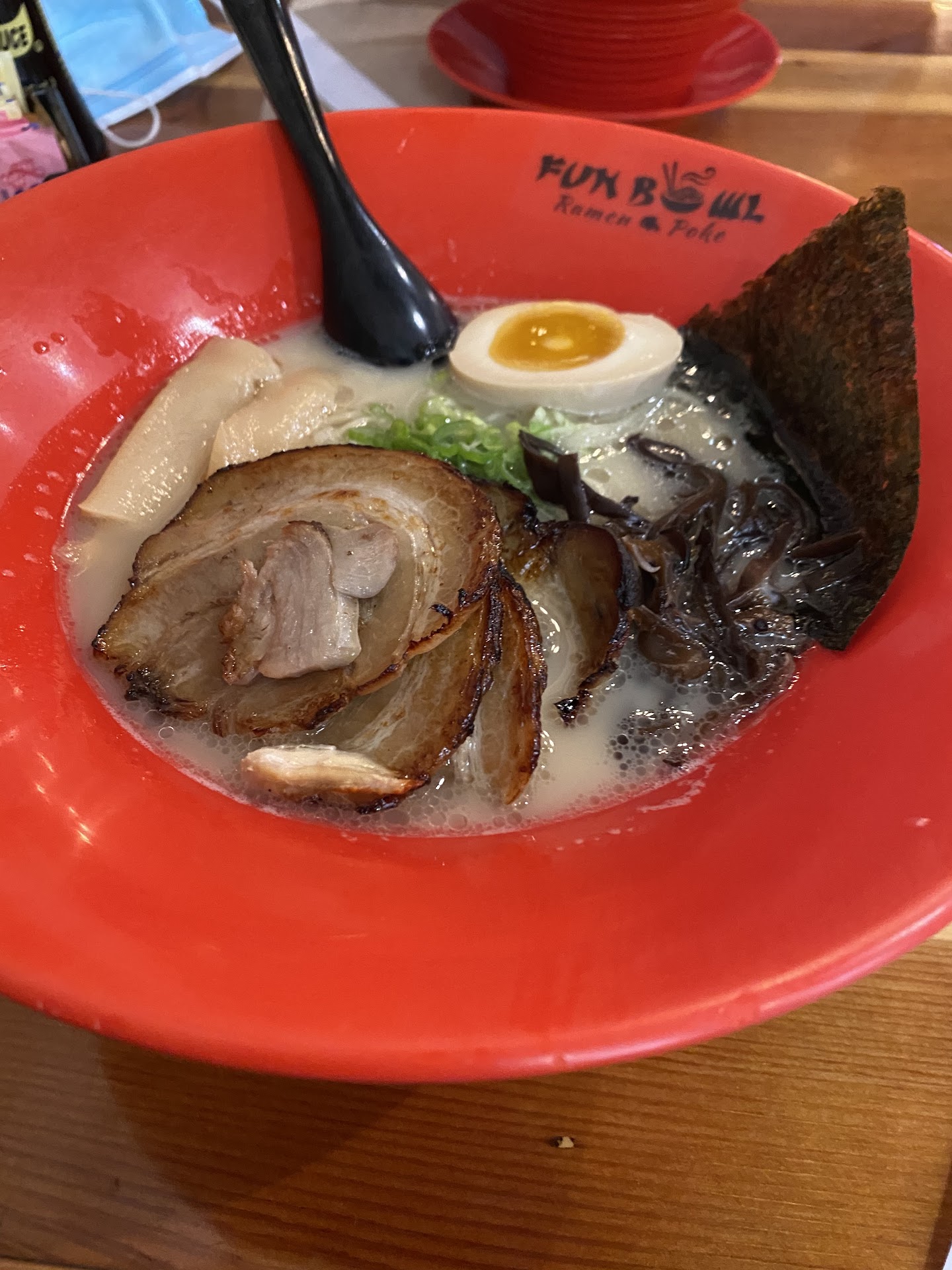 Read moreMy husband and I had take out from Fun Bowl, we tried to order online but that wasn't available. He ordered when he got there and it was super fast preparation, he only waited about five minutes. We got the Miso Ramen to share, a Fun Bowl, and the Alaskan Bowl. The Miso Ramen was excellent, we chose the Berkshire Pork Belly which was succulent and flavorful. The noodles were perfect, earthy and fresh, very obviously homemade, and delicious. The broth is something I will be craving for again soon! After sharing the Ramen, we moved on to our respective poke bowls. I had the Fun Bowl and chose the Japanese Dressing (wasabi flavor) and sushi rice for my base. It was my first poke bowl with corn although I understand that's a popular addition. Comparatively the serving was smaller than other places but for the same price. The tuna was fresh and tasty. There wasn't much edamame or garnish to speak of (garnish includes flying fish egg, sesame seed, scallion, and shredded Nori.) The mango and cucumber were perfectly ripe, but the avocado was a bit brown on the outside and had not been chopped all the way through. The seaweed salad was very good thankfully, as there was a great deal of it in the bowl. I would order without corn next time as it didn't seem harmonious with the rest of the flavors to me. My husband ate the Alaskan Bowl, he thought all the flavor in the bowl came from the red onion and jalapeno. I believe his exact words were, "that's the hottest jalapeno I've ever tasted!" His bowl didn't have nearly as much seaweed salad as mine did. We'll definitely go back for Ramen and will likely eat poke bowls again, I just hope for more consistency in the ingredient amounts and a nice balance with...