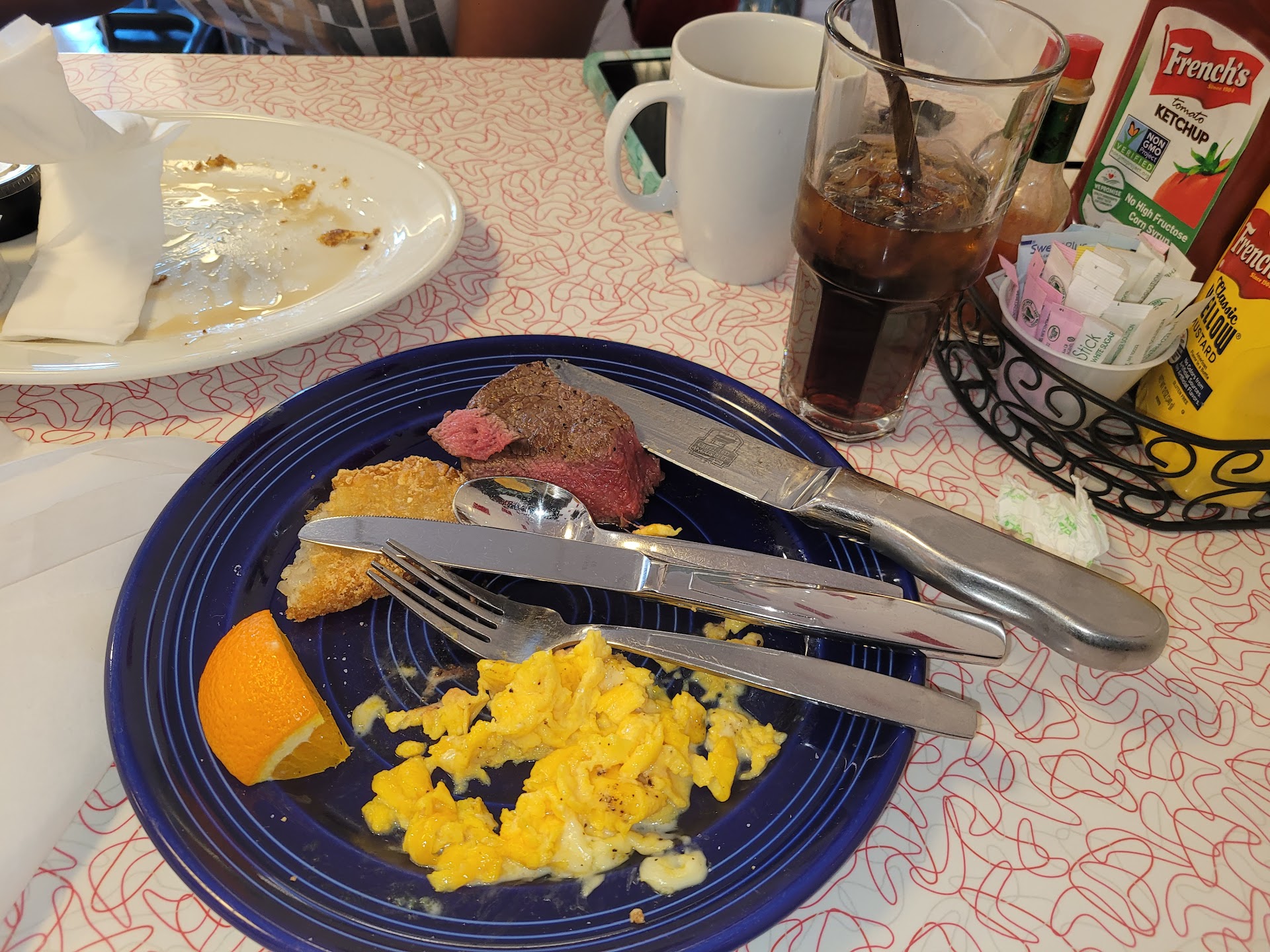 Read moreThis was our first time. Hostesses were pleasant and efficient, a small wait because of Covid restrictions. We wandered out to the goober’s garage to pass the time .. wow! What a treat! The fella inside was engaging and full of interesting facts about the cars , we were fascinated! We got the call for our table in no time. We were sat at a corner table ..the groovy linoleum table & red, chrome-accented chairs catapulted me back in time to my grandmothers kitchen, wonderfully nostalgic..and the place was spotless. Our server Mia was attentive and funny, our drinks were served promptly, the silverware was shiny & clean, the coffee cup was perfect.. I like a nice mug at a diner.. it matters, at least to me. We both ordered Big Breakfast so we could taste several offerings . Breakfast meats were exceptional , pancakes & french toast both delicious.. the shake of powdered sugar on top..a sweet touch. Eggs cooked perfectly and the hash browns, ordered a little well done, were stellar! Portions plentiful. In this age of Covid the condiments are now individually served and many places cut a corner in this aspect, ketchup packed in plastic lid ramekins, culled from some unknown source and the syrup an unfamiliar, mystery brand. Call me crazy but I’ve got some serious brand allegiance ..so the Heinz ketchup and Log cabin syrup at goober’s went a long way for this lady..