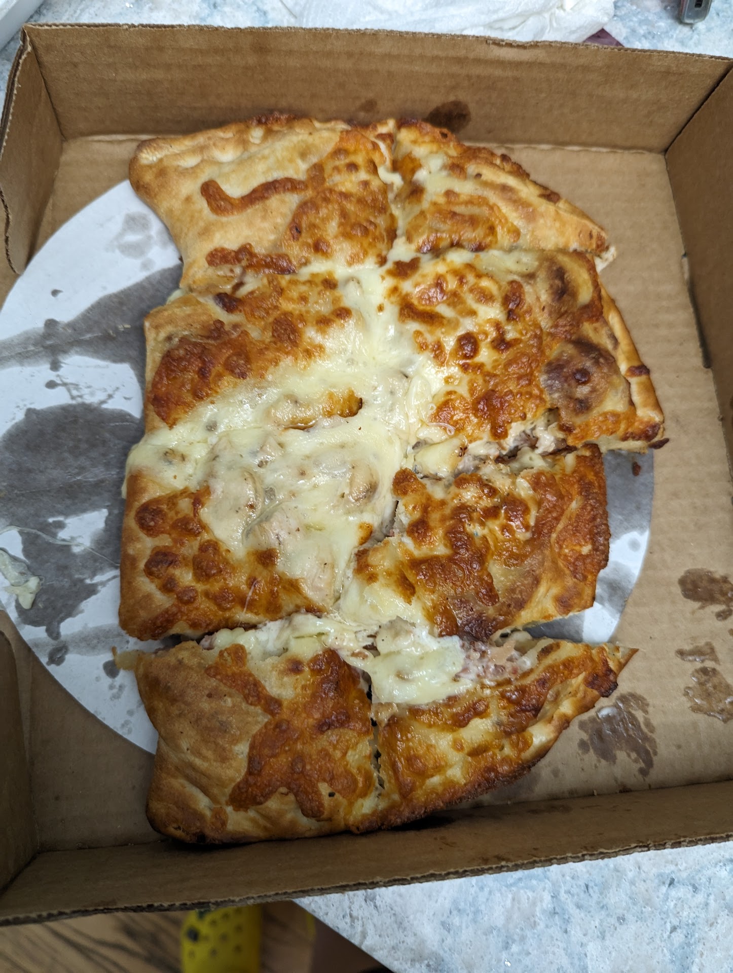 The chicken in the sub tasted great. All okay. My daughter went to start on some mozz sticks after they cooled a bit. As she opened the styrofoam box, i joked with her, that she should count them.