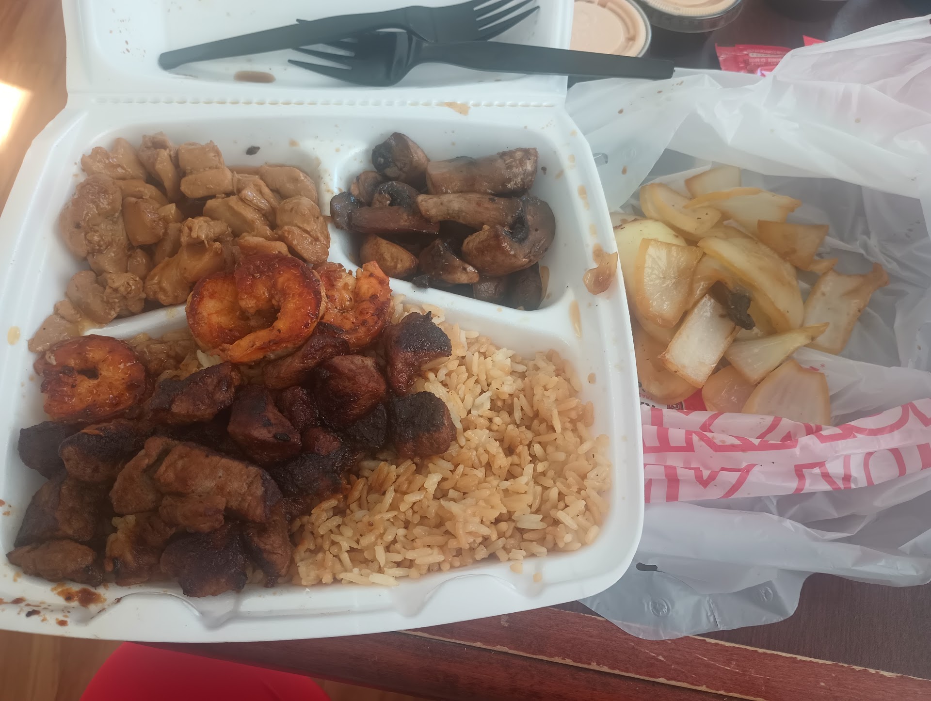 I placed an order online last night and was told the order would be ready at 6:35pm. The order consisted of one hibachi entree and one sushi roll. I arrived at 6:30 and let the girl behind the counter know I was there. She pointed to a bag on the counter and said my entree was ready, they were just waiting on the sushi.