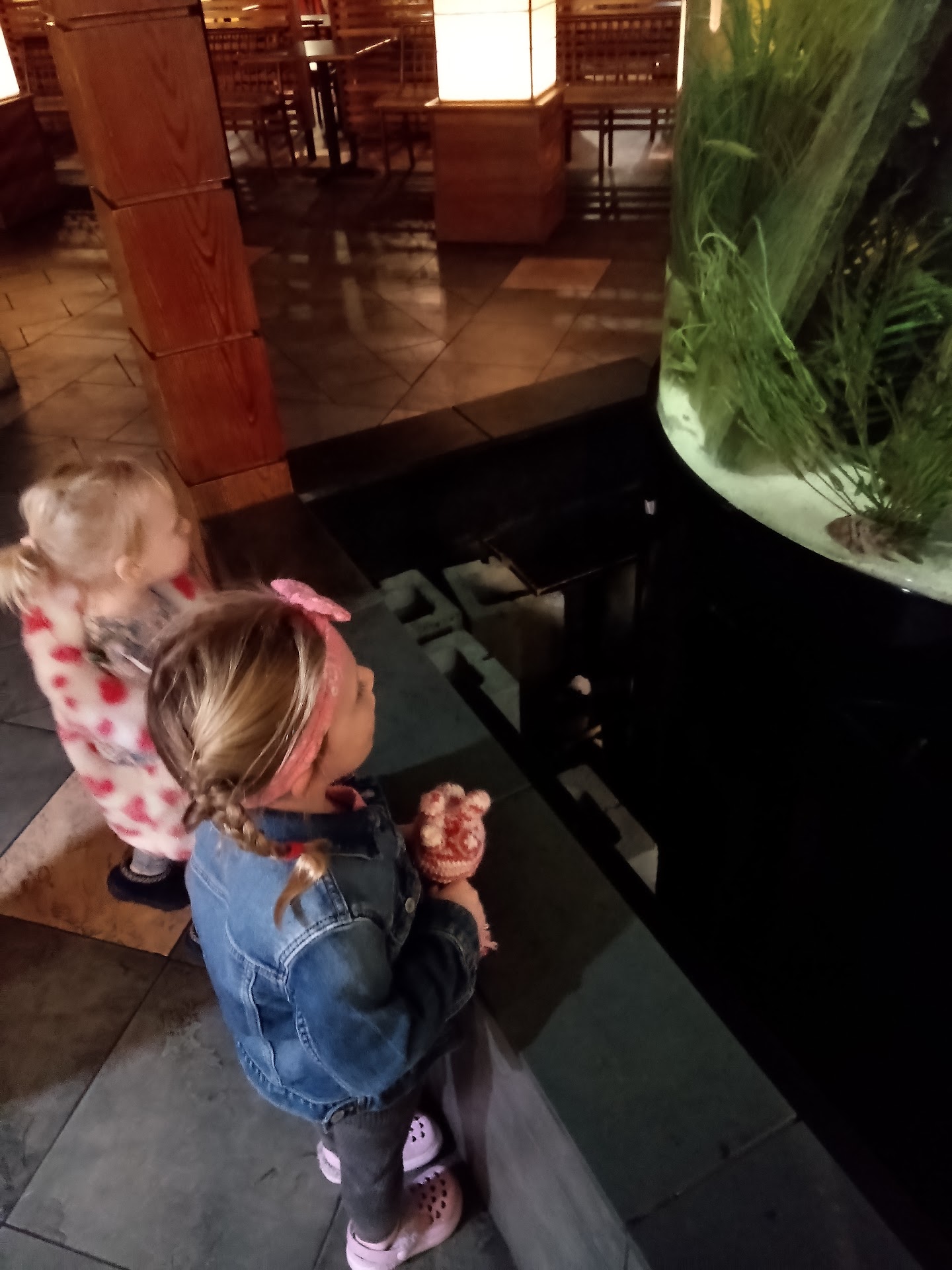 Upon entering, everything is like it's in a time capsule from 1999. Nothing has been updated. The fishtank seems improperly lit with dirty water and seemingly scratched glass. Generally speaking, everything in the foyer seemed dark and dingy and that goes double for the bathrooms which could use a deep clean.