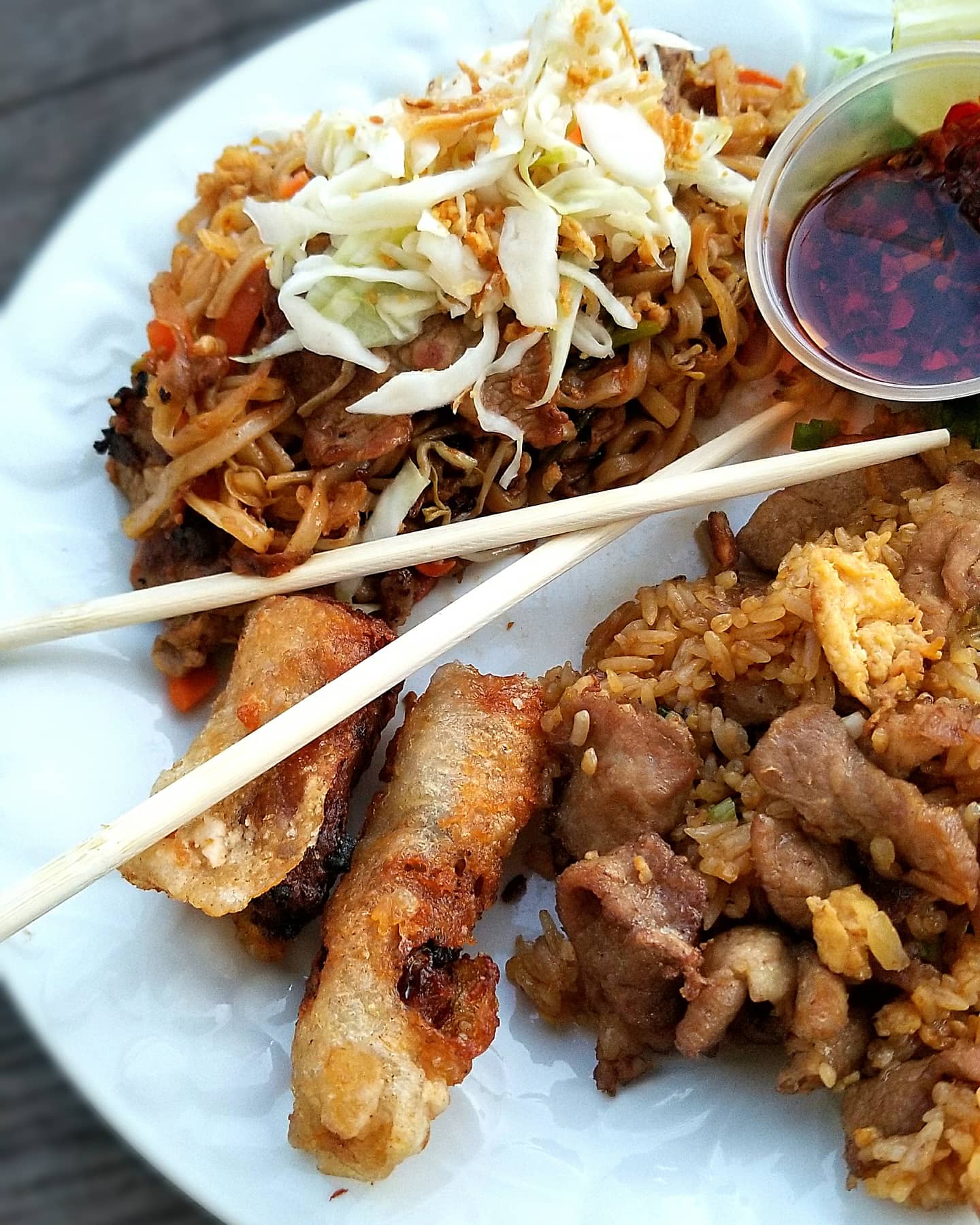 FOOD: Pork Pad Thai; Pork-Fried Rice: Cha Gio. Beginning with the Cha Gio appetizer (Vietnamese Nem | Ground chicken, carrots, onions, mushrooms and glass noodles wrapped in flaky rice paper and deep fried. Served with nuoc cham dipping sauce and lettuce on the side), I took my first bite of this delicate roll and I was hooked. I must admit that I had never tasted Cha Gio before but that changes immediately. Each one is savory, lightly fried and perfectly sized. The blends of fresh veggies and ground chicken are perfecly balanced so that you don't taste more of one ingredient than the other. Loved this appetizer. The pork-fried rice and Pad Thai were also homeruns! It's a rarity when you eat out, order multiple dishes from the menu and everything turns out to be nothing short of exceptional!!! The Pork Pad Thai is the best Pad Thai I've ever consumed....bar none. Hints of smokiness resonate throughout the dish from the light char on the pork and from a perfect wok it was prepared in. Adding the fresh, crisp cabbage salad, sauces and crushed peanuts on top, gave the dish a refreshing, subtle "crunch" and some sweet heat. The Pork-Fried Rice included a 50/50 ratio of grilled pork to fried rice!!! What!?!?! I have never been served a fried rice dish that included such an abundance of protein throughout!! Tender, fresh and charred to perfection. Unbelievable curbside dinner and I'm already thinking of what to order next time. SCORE: 5 STARS!!