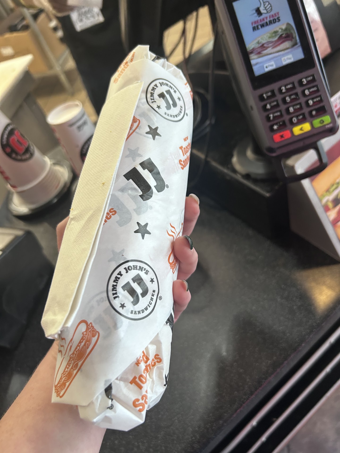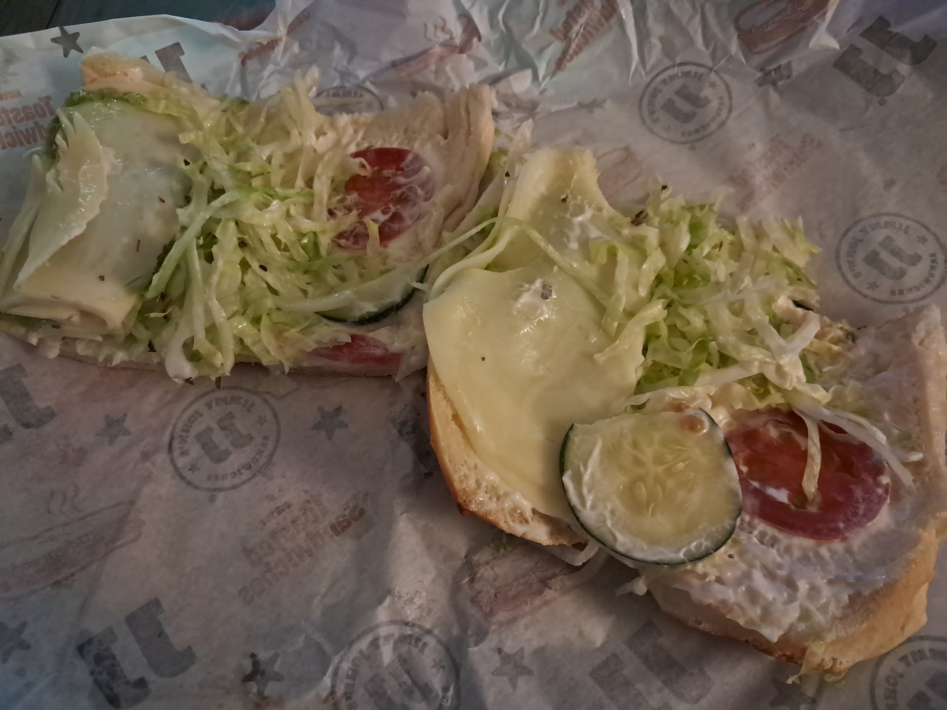 Read moreI've ordered from here multiple times. It's taken over an hour to get my food delivered multiple times. 1.5 hours once. Never given an explanation or apology or offered a discount. They charge a flat $4.00 delivery fee for going less than a mile. Today took 50 minutes and here is a pic of my "veggie sub". Yep. That's two tiny tomato slices, and 1 and 1/4 cucumber slice. The second sub I asked to add onion. They threw on exactly 1 tiny onion piece. This place is a joke. Never again. Hey, Jimmy Johns, I have my order number for you if you'd care to offer an...