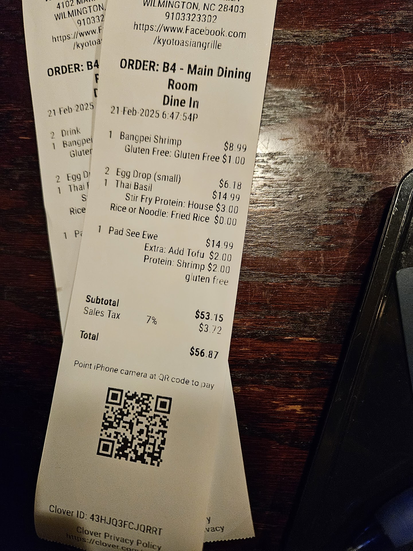 Read moreThe food is always good but the service sucked tonight. It took forever to get our menu and for someone to take our order. After we got our food, I requested chili oil which was never brought. No one checked on us the duration of our meal and we ended up having no water half way through. We were sitting in the back corner so it was hard to get someone's attention. The waitress brought our bill and I was not happy with it. I ordered the pad see ewe with tofu and shrimp. I literally always order this everytime I come here. On the menu, the pad see ewe is $14.99 for chicken/tofu. I know there is an additional charge for the shrimp. However, the waitress charged me $2.00 for the tofu and $2.00 for the shrimp. That makes no sense when my boyfriend got the thai basil stir fry for $14.99 but got house protein, which is chicken, beef, and pork, for additional $3.00. So how did I end up paying more than my boyfriend when I only got 2 proteins. There shouldn't have been additional charge for the tofu when that is included in the base price. She tried explaining it to me but made no sense to me. Also, I have never been charged here for making my food gluten free so if there is going to be upcharge it needs to be stated...