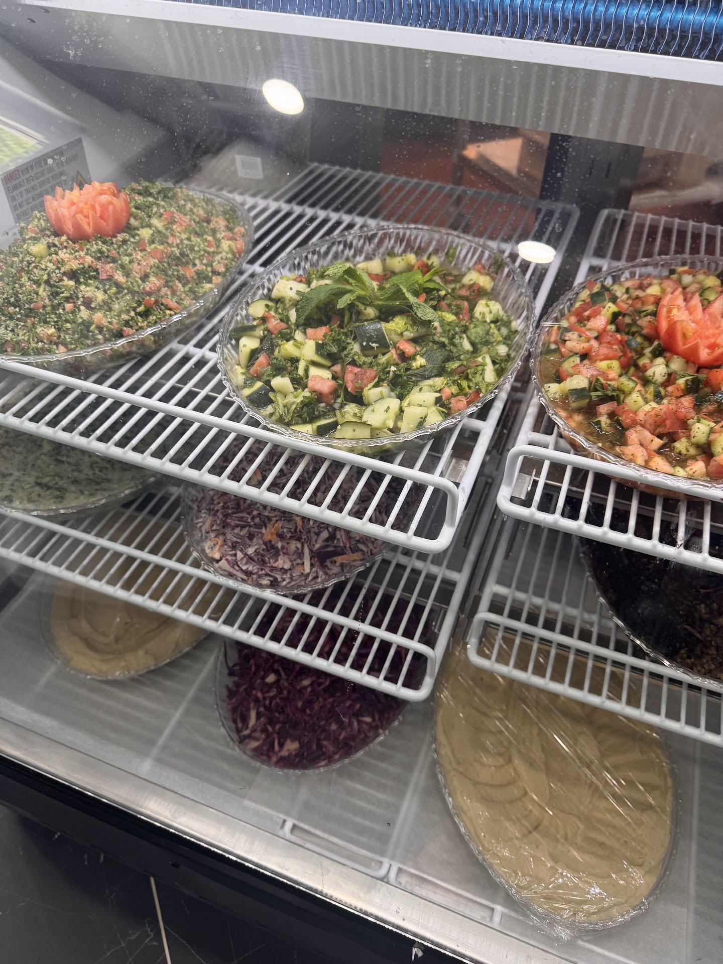 (This was a month ago on April 13th, btw!) My mother came with me to run some errands & get lunch. When we pulled in the parking lot, I told her “ok, we can just check it out & leave” because it didn’t really make sense being at the back of the side parking lot of a convenience mart…. As you approach, you’ll see that there’s a new deck, lighting & picnic tables. The door & entry are new & clean. The interior was completely unexpected. Bright, new & clean. A case of delicious salads & baklava! We were greeted with a warm smile from the Queen herself!