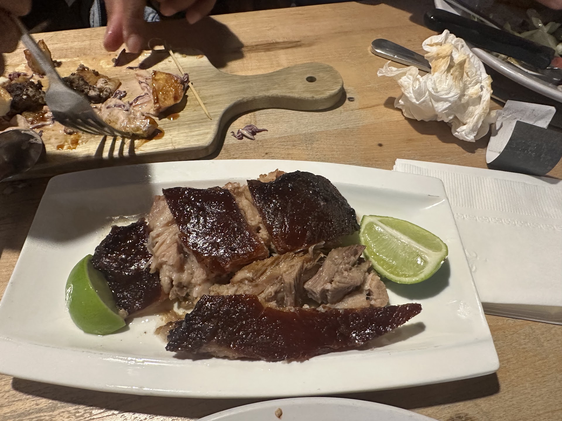 Primero que nada, un aplauso pa’ Christine, nuestra mesera—súper dulce, súper atenta, y con energía de que ya nos conocíamos de antes. Y después llega Jasmine, aka la Reina del Mamajuana 👑. Ella notó que mi felicidad en ese momento era corta, y se propuso sacarle el jugo a cada segundo. Y boom—nos trae unos shots de Mamajuana curada. No es cualquier trago, esto fue medicina ancestral. Ahora… LA COMIDA. Sushi dominicano. Sí, leíste bien. Tres golpes en forma de sushi roll. Casi lloro. Después llegó el churrasco con tostones y mira… nunca le he tenido tanto respeto a un plato. Mi esposo pidió chuletas con arroz y habichuelas, y mi amiga se devoró los chimi tostones como si fuera su última cena.
