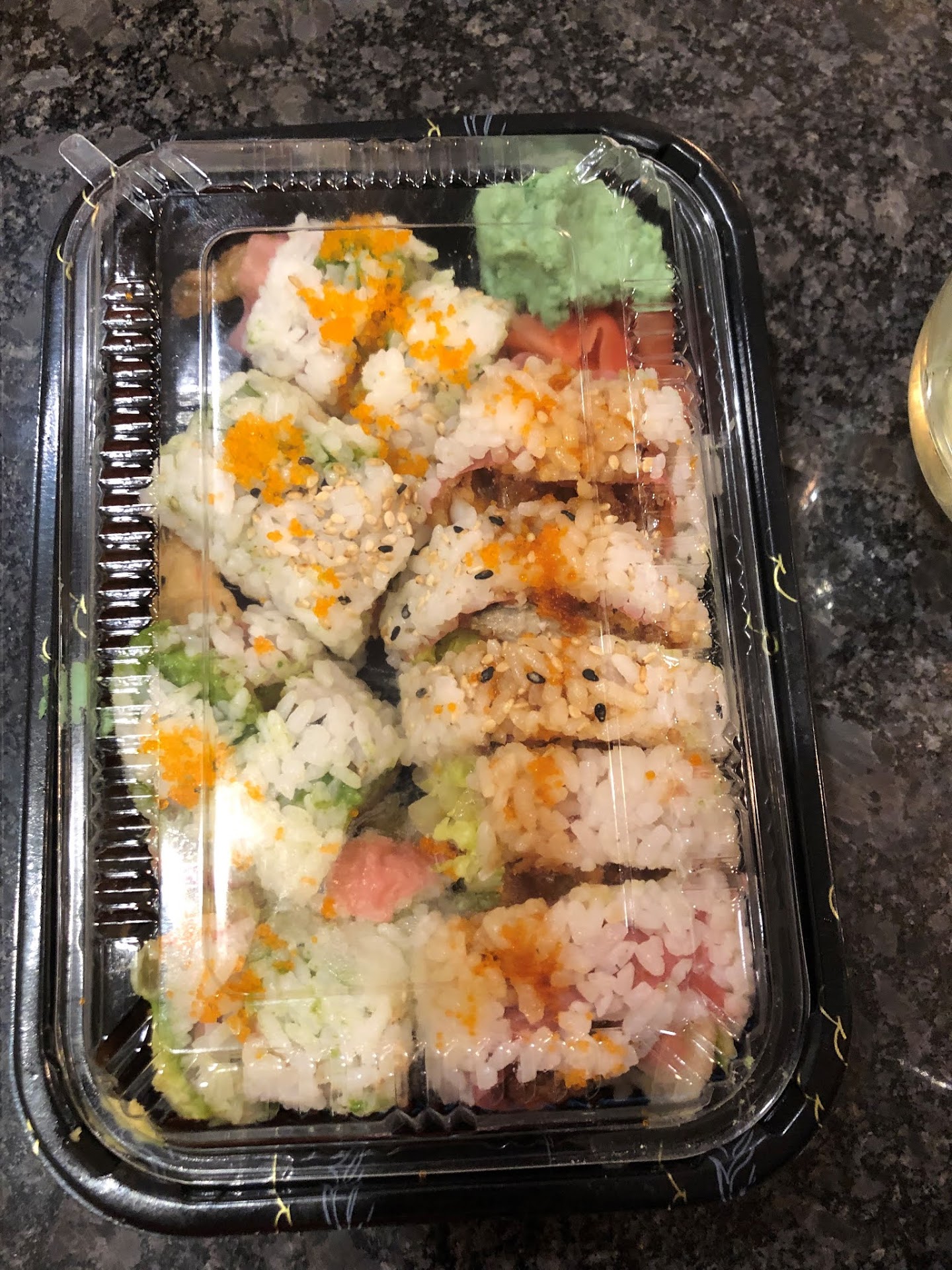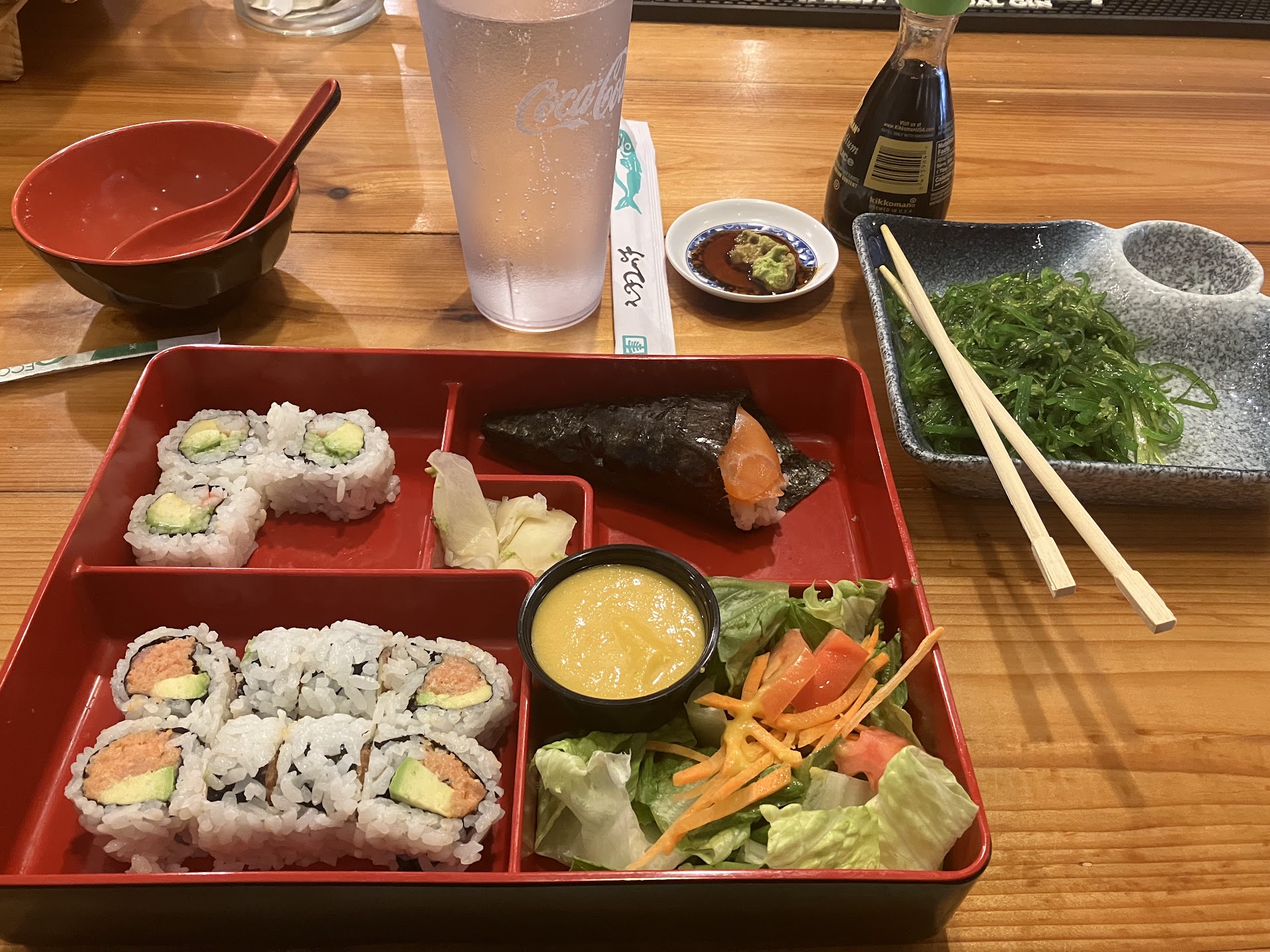 I ordered the Salmon bento box and my husband ordered three specialty roles. The Salmon was awful! It's sad to say but I have had fresher better Salmon at a Sakura in Missouri than here and you can't get much further from the ocean. There was no skin on the salmon and the cut had clearly been frozen probably even cooked from frozen. The rice in the bento was also not cooked right. Won't...