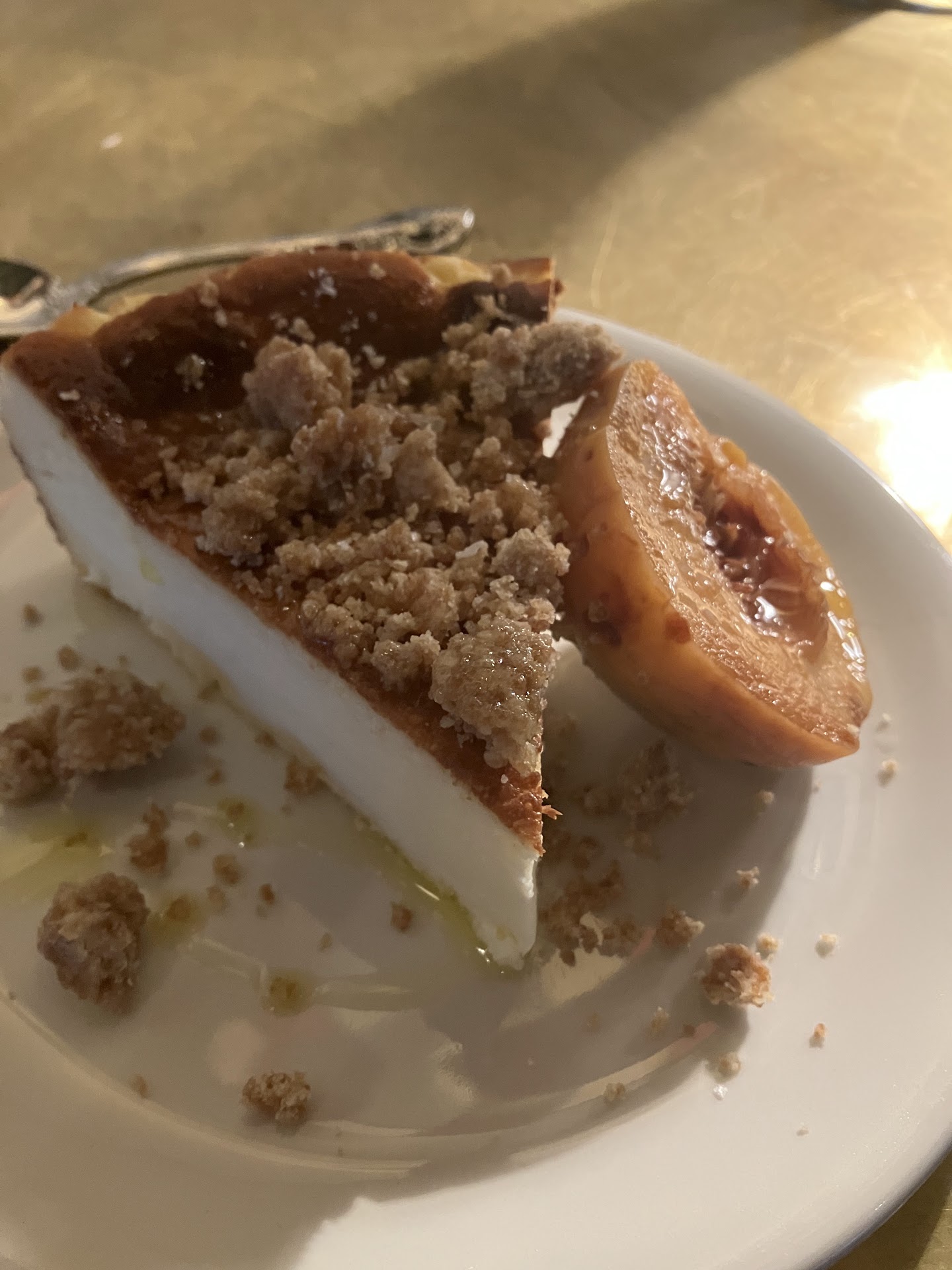 My last course was a peach cream cheese dessert. Yes, two bites and it too was packaged to go. All I can say about this is YUMMY, Yummy, YUMMY!!!!