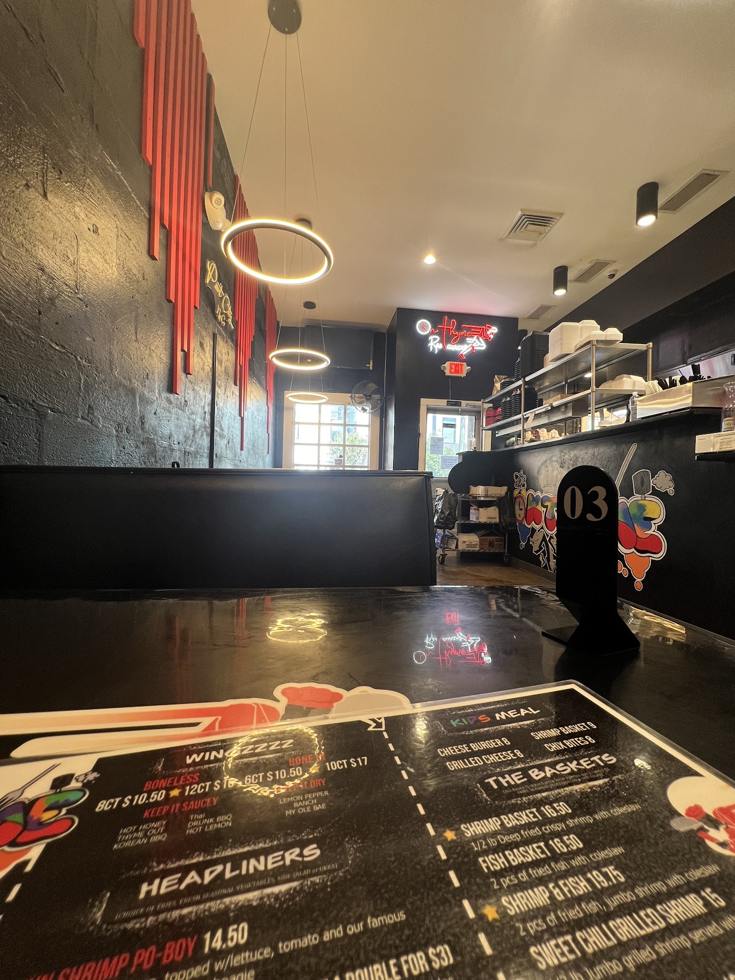 Ā Ā Ā Read moreOn Thyme Restaurant offers a lively dining experience with bold personality from the moment you walk in. The dĆ©cor strikes a perfect balance between modern and fun ā think bright red chairs against sleek black walls, a playful neon moss-wall sign, and polished concrete floors that give it a fresh, urban vibe. The atmosphere is upbeat but still comfortable, making it a great place to relax and enjoy a meal.