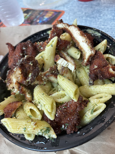 Read more• Calzone: The crust had a nice rustic, slightly charred finish and a good chew, though it was a little flour-heavy on the outside. The filling was cheesy and flavorful, with a solid balance of sauce, cheese, and meats. The side of marinara added a fresh tang that paired well with each bite. • Pasta with Fried Chicken: The penne was cooked well and coated in a creamy, herb-seasoned sauce that had a nice garlicky punch. The breaded chicken was crispy on the outside and tender inside, adding great texture to the dish. A sprinkle of Parmesan tied everything together.