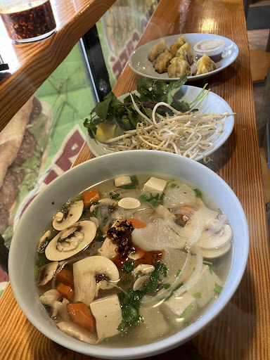 When she comes to the register to take our order she says “dining in or taking out?” We answer “dining in” and she says “what can I get for you?” I say “my mom would like only broth and noodles - not any of the extras like onions, scallions, or meat or the other toppings - she can only have broth and noodles. What do you recommend?” She says “oh you should get Plain Broth order - comes with only broth and noodles, that would be best.” I say “perfect we will do plain broth with comes with only noodles and broth. And I will get vegetarian pho but I only want tofu and mushrooms - I don’t want to waste the carrots, daikon, onions or scallions, so you do not have to give me those in my bowl - just broth, noodles, mushrooms, and tofu, please.” And she says “no you can’t order it that way - the carrots and daikon are big pieces - you just pick them out yourself. We serve the vegetarian pho only one way and you have to pick out, it’s super easy you can do it.” I say “yes maam but if you are chopping these vegetables up fresh and throwing them into my bowl of soup - I am just saying I don’t want you to waste those pieces on me.” She said “no you have to pick them out ok. Anything else?”