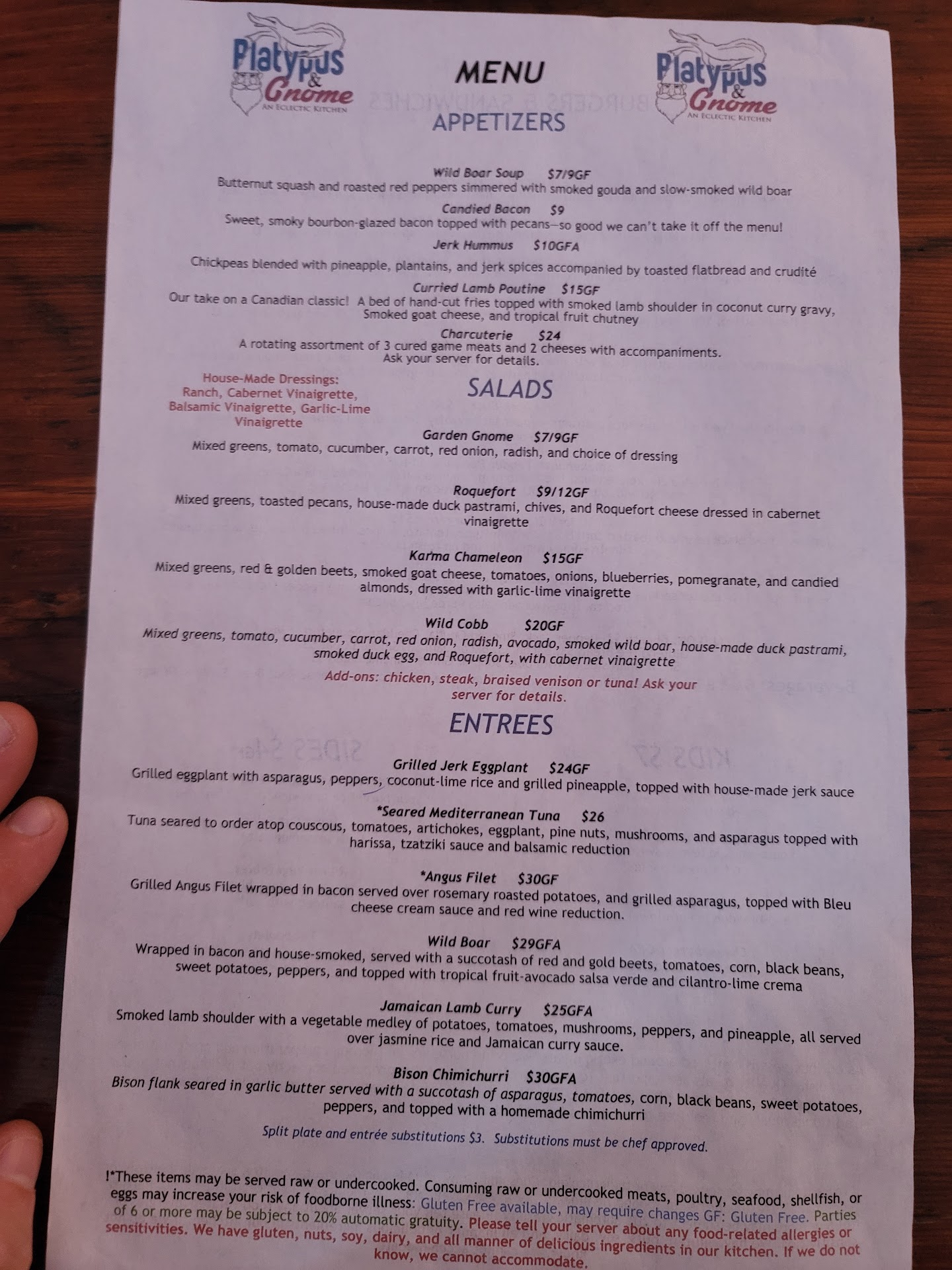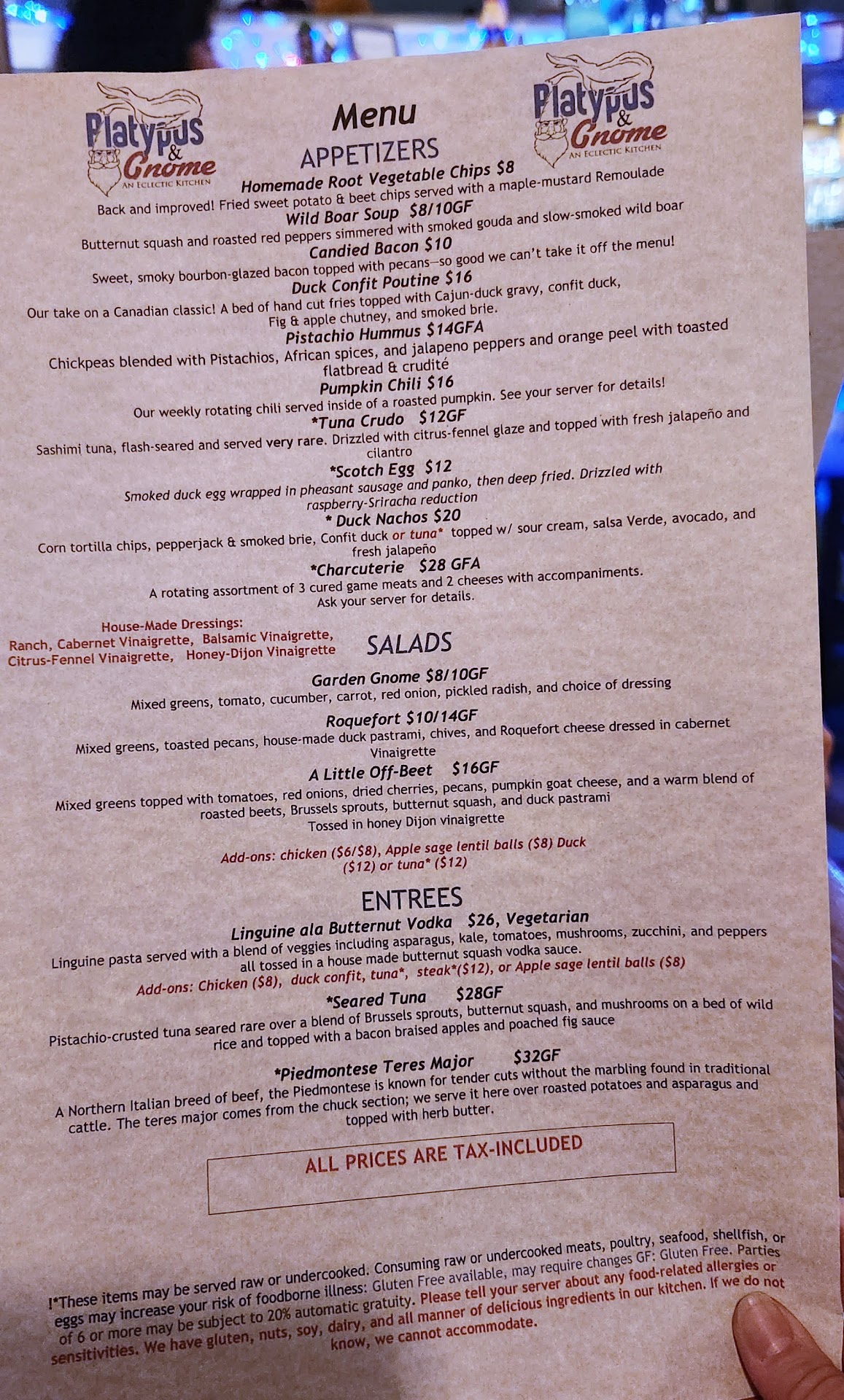 Platypus and Gnome's inventive menu makes abundant use of boar, duck, and squash in interesting ways. Appetizers include game poutine, candied bacon, and duck l'orange flatbread, sandwiches include everything from an elk burger to duck confit to a squash cake, and entrees range from the requisite New York strip to bacon-wrapped boar to braised venison.