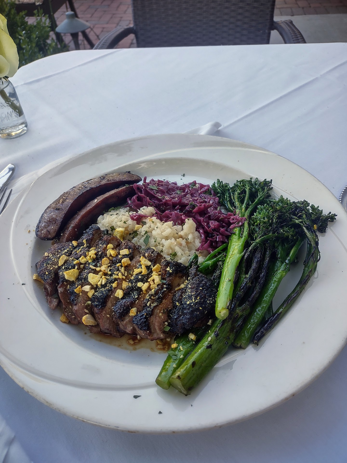 This restaurant has a very nice outdoor area. We got there when it was light out and finished up when it was dark & all the decorative lights were on. It was a really nice atmosphere. 5 stars there. The food was a mixed bag. If I was scoring just on the steak and salads it would be 5 stars. We got the "STEAK KNIFE SOUTHERN WEDGE SALADâ and the "FARMER'S MARKET" SALAD. Both were delicious. For our entrees we got the USDA PRIME ANGUS BEEF RIB EYE STEAK 16 0z with the buttermilk-chive mashed potatoes, drunken mushrooms with sautĂŠed spinach, pink peppercorn-horseradish crème option and the Pan-seared NC GROUPER with the ~ shrimp & crawfish succotash, Southern style stone-ground grits, pimento cheese butter option. The steak was an outstanding cut of meat, seasoned and cooked perfect. The mashed potatoes were lackluster. Seems like they needed more butter, salt and cream. The mushrooms and spinach were delicious. As for the grouper, the piece of fish came out not all in one piece. There was a large part on the edge of the bowl and over cooked.(see my pics) It was seasoned well but kinda disappointing. The grits were clumpy/dry. The succotash had one shrimp and I did not see any crawfish. I could have done without the grits and succotash. Just not executed very well. As for the service our waitress was extremely nice but the service was not very good. We ordered an unsweet tea and an old fashion mixed drink. The old fashion took a while to come out. The tea came out sweet the first go around. During the meal I ended up with no tea and waited for a refill a couple times. The wait for our entrees after the salads was way to long. From the time we sat down, ordered, had our salads and then received our entrees one hour 15min had gone by. We sat at 6:30. We finished our meal with no dessert at 8:10pm. Everything just seemed very slow. We enjoyed the atmosphere so it was not a big deal but not ideal. I would go back and try it again but probably make...
